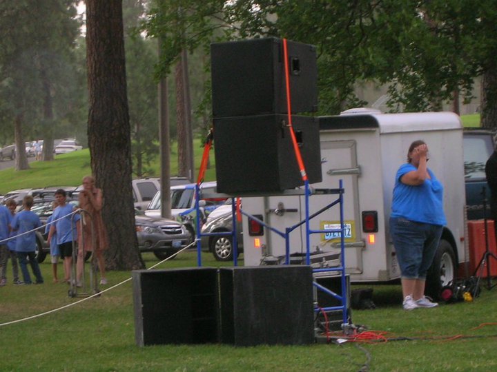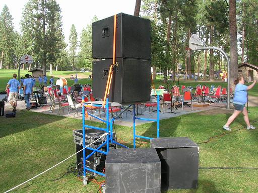 I was actually surprised at the stability of this setup. I stacked at the trailer and rolled the stage left speaker tower across the bumpy grass. I'm considering some sort of bolt or better yet, a strap arrangement to the subs for additional stability. By standing on the amp rack or one of the subs, I easily stacked both boxes on the top rung of the 4' scaffold, and then tipped both forward with 2X4s. Thanks for the suggestion, but, I really don't want to carry around any more scaffold parts, or pick up the amp rack any more than I have to!