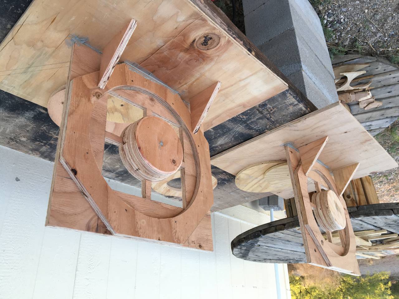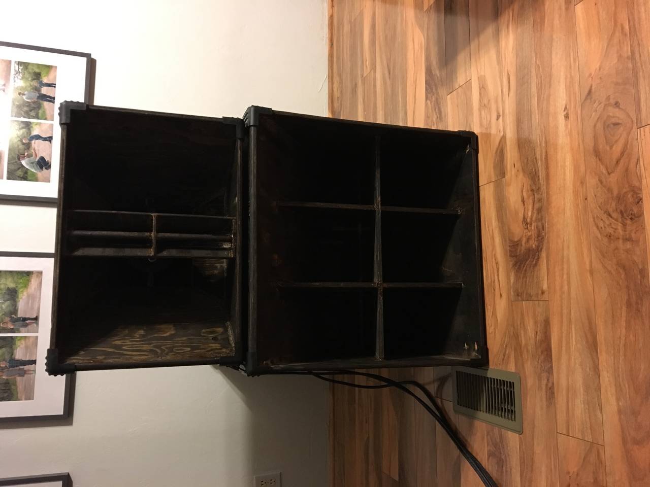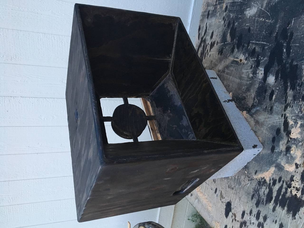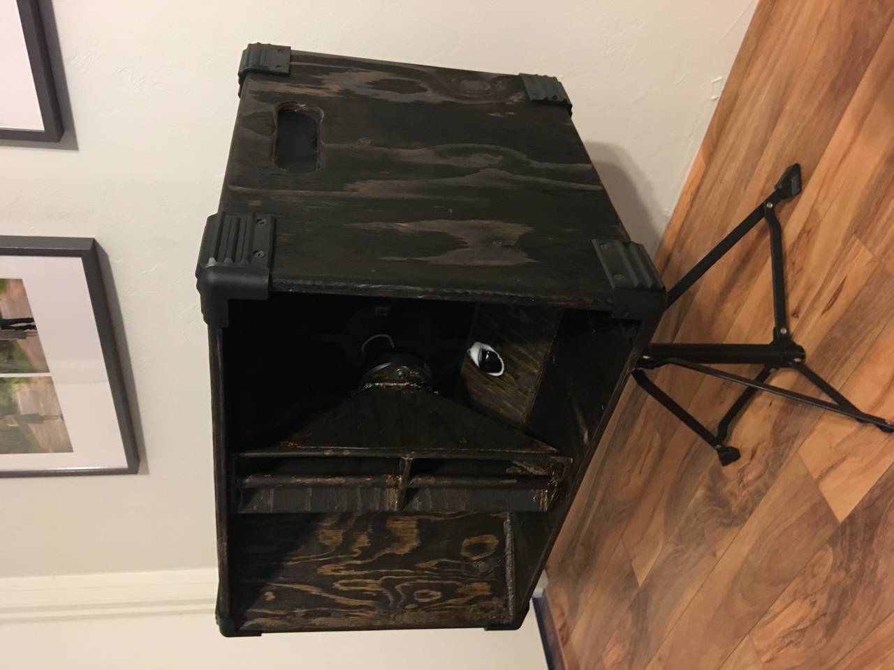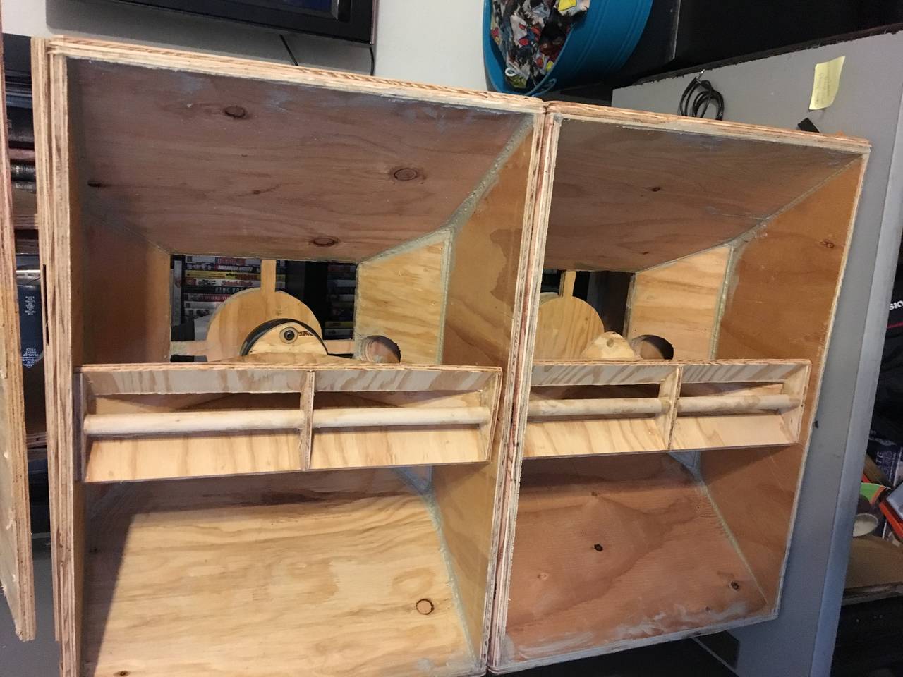 Not bad for my first pair, perhaps I will get better over time. Did the whole rough wood stained thing to match my subs. I just about built these ot12s on a single $25 sheet of cheap 5ply plywood. It bows and is real crude but with enough glue it works out well.