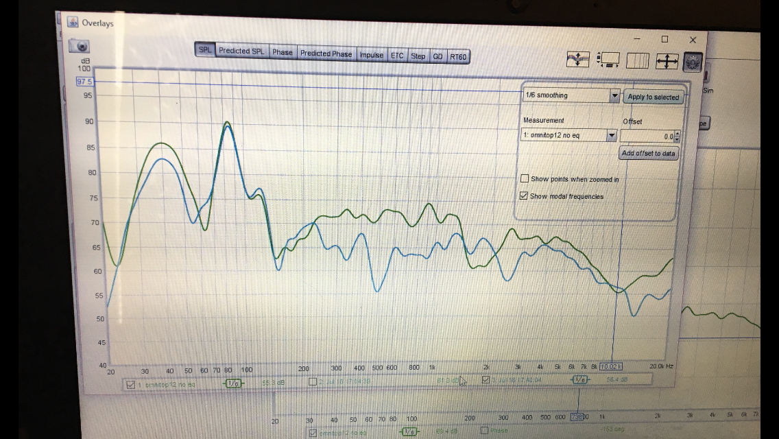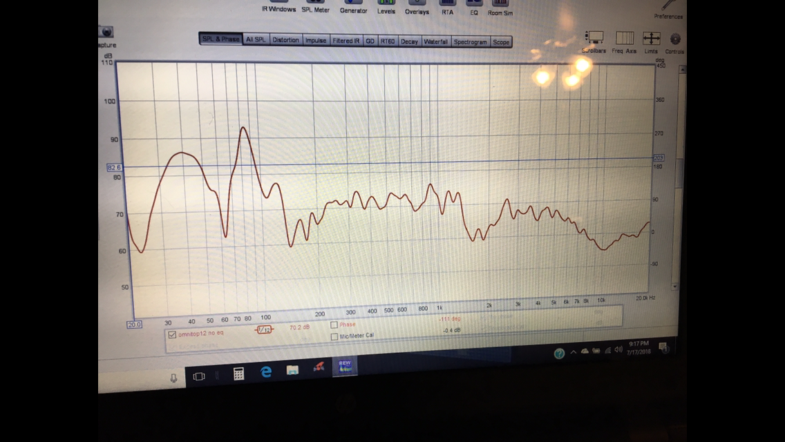 So today I set up my ot12 and a t45 to test it out, I found that like the picture shows 7.40ft of delay did the trick and 7.49ft did the high freq horn. I I did a low pass on the sub at 70hz 12db slope. Ot12 100hz 24db, 2k 24db for high/low pass. Pictured with room eq wizard no eq applies and with some eq applied.