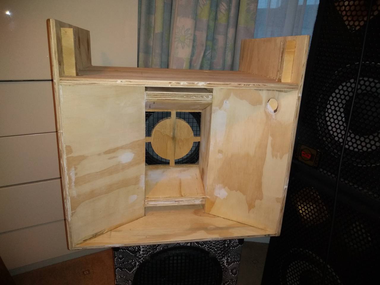 Sealed up now, I'm trialling drivers. No tweeters yet, I'm seeing how it sounds without first.