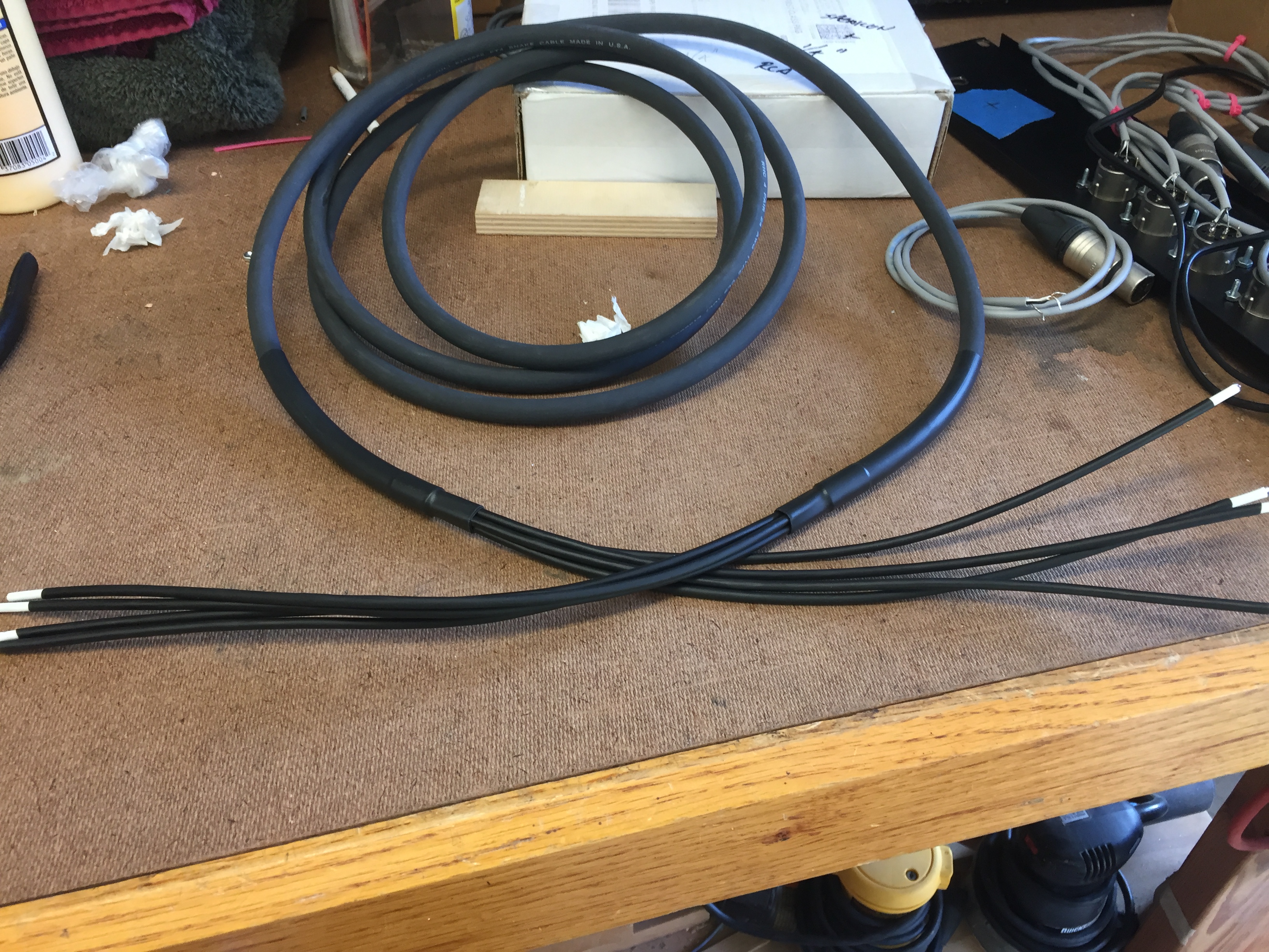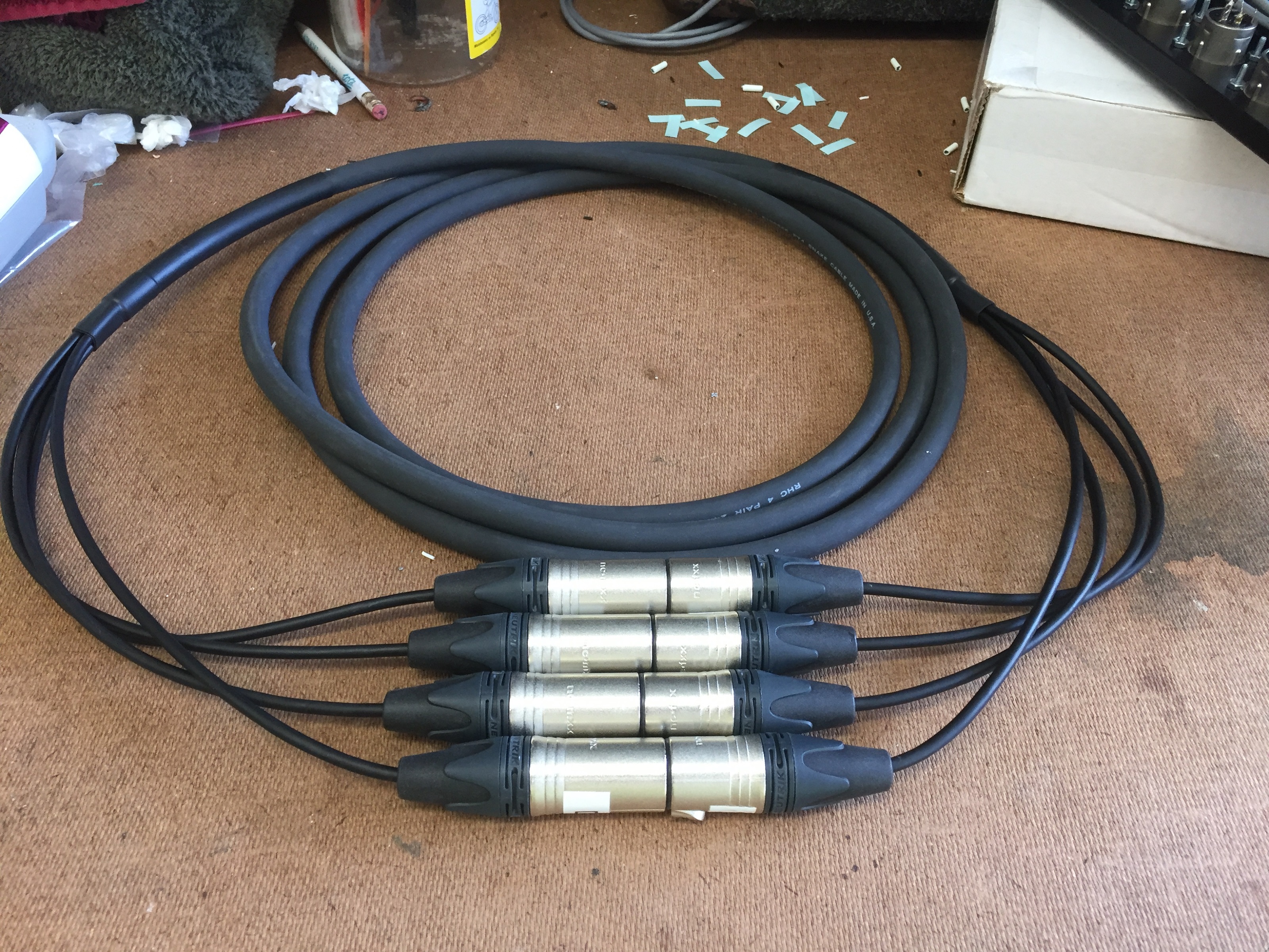 Figured since there would now be 4 cables coming to the rack from the board, I might as well use that piece of leftover 4 pair snake cable and build a little 10 foot snake to take care of the Mains L/R and the two Shure transmitters.