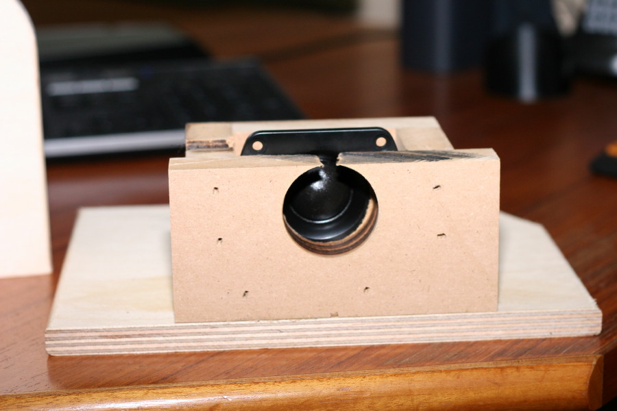 Then I thought what can I use to hold this thing down besides my finger? and it hit me, I just cut another small scrap and put a 8/32 hurricane nut in it and fastened that on the top then ran a 2" screw through it till it made contact with the magnet on the back of the tweeter and gave it another full turn, it held like it was in a vise!