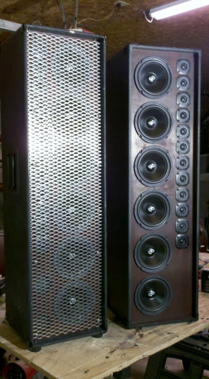 However, If you must build something "Off The Reservation", let me fill you in on some of our experiences. We built the original SLA's for Ewetho's home theatre. They were so impressive; by impressive I mean smooth and accurate with excellent off axis response and great imaging. We had some 5" MCM mid-bass drivers laying about so we decided to see what would happen if we made a larger SLA with those. We used the same Goldwood tweets as in the standard SLA. We called this model the SLA Extreme. You can see it in the picture below next to our test model of a boolshelf SLA. We found that the 12 tweets were a tad bright against the 6 - 5" bass drivers but a minor dab of EQ brought the cab in line. The next idea was to move a bit more air and even out the cab so we went to the 6" Mid-Bass drivers. These were a perfect match to the 12 tweets. The cab at the begining of this post has the identical sound characteristics as the original SLA just louder and with a larger sound front. We compared them to my Otop15's with melded arrays. The large SLA (we call it the 612) has a much flatter response and needs almost no EQ. It also has a sweeter sound than the Otop15. The Otop gets louder on less power but at 400 watts the SLA is in the 120Db realm so we are happy. The Otop15 melded and the SLA are very similar in off axis response with the Otop having a slight edge but not enough to be a deal breaker. We like the large SLA for indoor use due to it's pattern control and sweet even sound. Watch and listen to the video from Radian at the beginning of this thread. We use the large SLAs for FOH, Back Line and Monitoring. The Otops are now strictly for Outdoor use (we use 2 per side stacked).