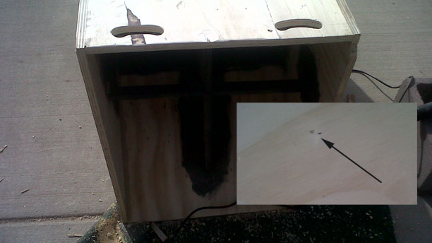 I removed the Driver access door because during testing there appeared to be a leak coming from inside the Speakon cable plug. Here I’m staining with the grain with minwax ebony wood finish. Initially we wanted to carpet the tuba or spray with duratex but settled on black wood finish with four coats of interior polyurethane.