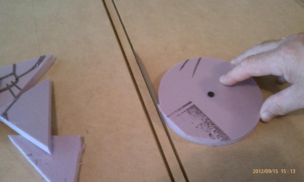 I used the table saw trick- drilling a hole 2.5" away from the blade, sticking a drywall screw through the pink stuff and cutting the corners until it was round.