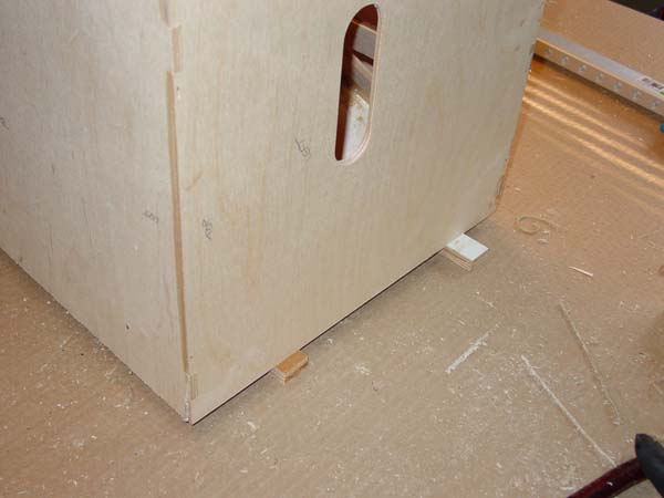 First shows how to get the horn to line up with the cabinet. I placed a couple of 1/2" pieces, wider than the cabinet, under the sides of the horn section, so the not yet flat top and bottom fronts don't reach the table. Then the cabinet can slide right over the horn, also resting on the 1/2" pieces, making everything fit nicely, no fasteners needed at all. This may not make sense until you are building one, kind of hard to describe. Wish I had of thought of this for the 1/2" W8.