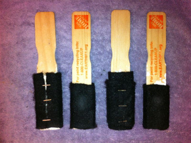 I took wooden paint stirrers, cut a couple of two inch sections off the end, glued one piece on each side, then covered with some rat fur....a little glue and some staples.