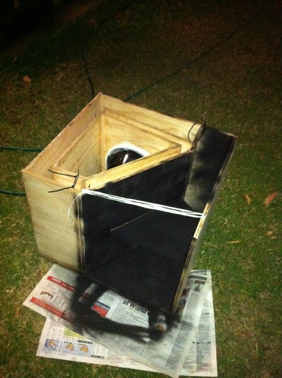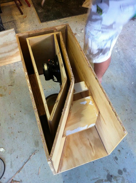 BAT10, Bad Auto Tuba. Reverse folded TAT to fit JBL 1014D, 350W driver, voltage limit unknown.
