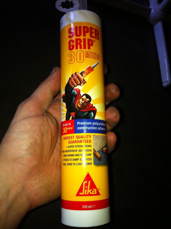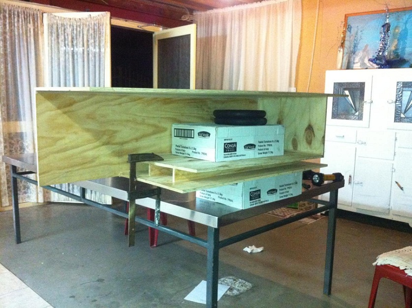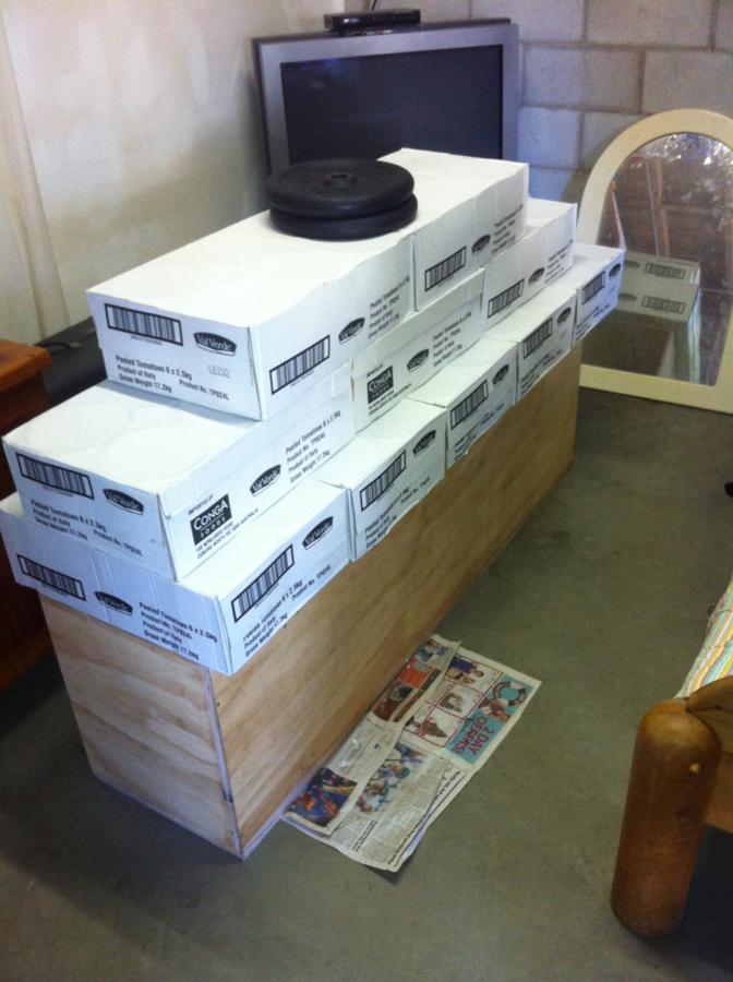 This is how it is sitting at the moment, I don't have any clamps large enough for this thing, but I have plenty of heavy boxes, so I stacked about 200kg on top of it