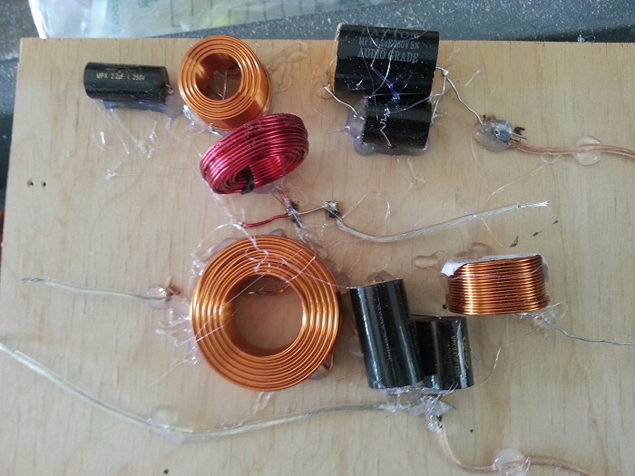 Hand made, by me, (using Bill's favorite crossover calculator) 4kHz 3rd order butterworth on Philippine mahogany for my center. Notice that in some parts two inductors are in series and two capacitors are in parallel to make oddball capacitance values. I took the time to rotate the inductors as per suggestions for my TLAH build. Oh, and hot glued to make sure nothing resonates, last time I forgot or neglected it and very much regretted it (later went back and fixed).