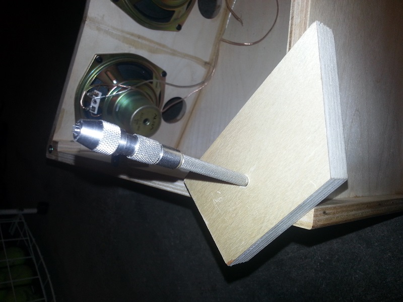 You wouldn't believe how much work it is to install these woofers rear mounted. Being smart I forgot to predrill from the rear clearance holes for the screws to secure the woofers. This is ignoring the fact that the holes for the woofers are so tight that you have to trim the black surround (a little ridge prevents it from sliding in easily) with a file. Back to the drilling... so I used the tools pictured below to get in the screws, after pre-drilling the holes by hand. Yes the contraption you see (wood piece surrounding a hand drill/bit) was hand turned some 100 times per screw hole (besides the ones where a power drill could reach (only 4 of those). The one's in the far corners were too close to the edge to use anything but my right angle screwdriver and for these it was incredibly painful because the range of motion was restricted to 30 degrees and I had to pilot the hole with the screwdriver (fingers still numb). However, I made it through all the woofers and I wired up the electrical side of things rather smoothly. Tweeters will have to wait for tomorrow and they require (only) a 3 step process: mark placement with tweeter in hole, drill out plastic in tweeter to fit screw and avoid splitting the plastic on install, and finally pre-drill the tweeter screw holes (then install). Let's just say I'll only be doing this the once (next time I'll drill the necessary holes when the baffle is in little pieces and flat).