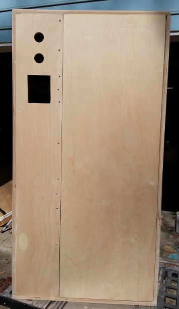 State of the Cabinet-note the position of the internal vertical brace, which is wrong and prevents the woofers from being mounted. This brace will be cut top and bottom, about 2" from the ends, and displaced 2" to the right as viewed from the rear of the cabinet. All existing attachments to the distal ends of the braces will be preserved.