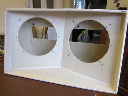 I put adhesive on the carcass for most of the joints but put it on the baffle for the last edge as I was worried that I wouldn't get any glue between the baffle edge and the carcass otherwise (maybe I made my fit too tight). I found it quite difficult to fit the baffles without the adhesive from the last edge wiping off on the carcass before the panel was in place (see the bottom edge of the right hand baffle in the picture below). I've got a fair bit of excess adhesive to remove from some areas. Hopefully I had enough left in there to give good and airtight joints, but there is very little squeeze out evident on some of them. I'll probably end up adding some kind of sealant to make sure, and also to produce a nice fillet as these joints will be visible (I'll be using individual round grills for each speaker rather than a grill that covers the whole front - after all the work on the angled baffles I want people to be able to see them!).
