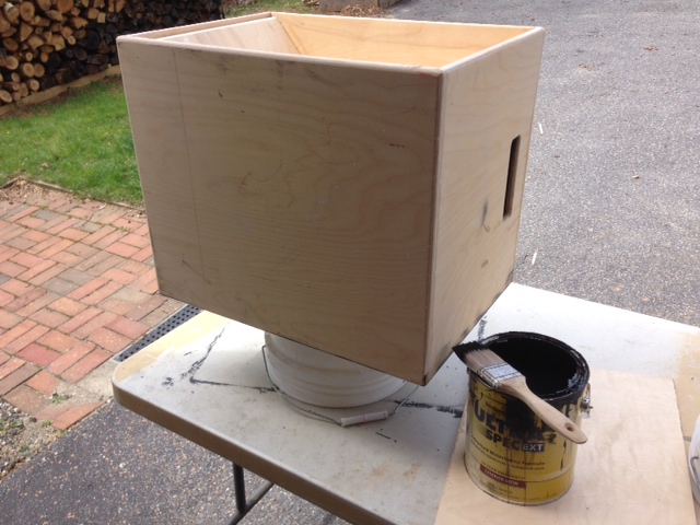 I like to be able to paint my OT12 Speakers all at one time. I am a contractor and as a consequence I have a lot of 5 gallon empty joint compound buckets around and I use them for everything. It turns out that an inverted bucket makes a nice painting stand for an OT as shown in the picture. I paint my cabs first with a coat of exterior black latex and then top coat with Duratex. Whenever any of the local paint stores have a complimentary paint offer I always buy black paint! The edge of the bucket pits perfectly inside the spacer ring on the inside of the cabinet.
