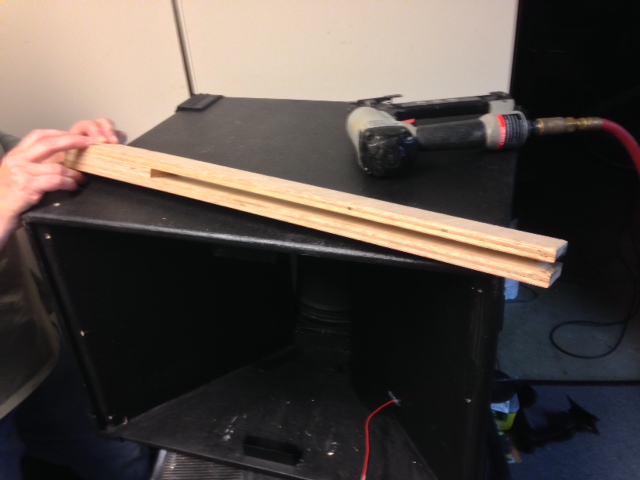 In use I slip this over the edge of the top surface that I am nailing into and the bottom of the guide stops at the edge of the board underneath. I position my nailer against the edge of the top part of the nailing guide and then fire away. All I have to worry about now is keeping the nailer perpendicular to the top surface. In the example I have slipped the guide over the top of the OT12 cabinet and the edge has stopped at the intersection of the top and the right side of the horn section.