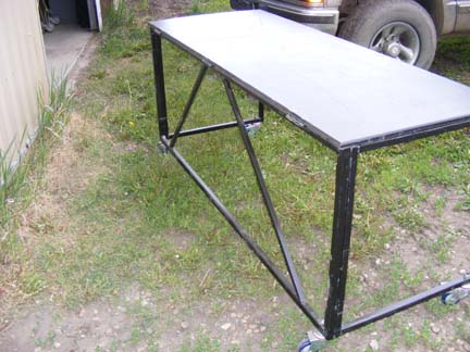 Nice. I may have to nick your idea. At the moment I am using a pair of sawhorses and an old bit of wood (8'x2'). Although this works, it is vunerable if someone falls into it whilst drunk/other. At least you know that if anyone falls into yours, they are going to be the ones who are hurt and not your own expensive kit. Thanks