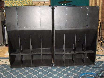 The T39's are done. :hyper: Tim finished the cabs and coating Friday. I wired them up yesterday and installed the speakers today. I have not weighed them, but compared to my Ampeg V2's, these things are light. Much lighter than the Qsc Ksubs we have been using. I'll post a weight if that is allowed. Even the size at 28" is not that bad.