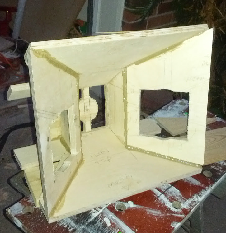 Got the shell assembled last night. I wish I'd remembered that I had those right angle clamps when I was dealing with the front sides, which were inclined to flop around on me while moving it around to get brads in connecting it to the side. It's pretty darn square now.