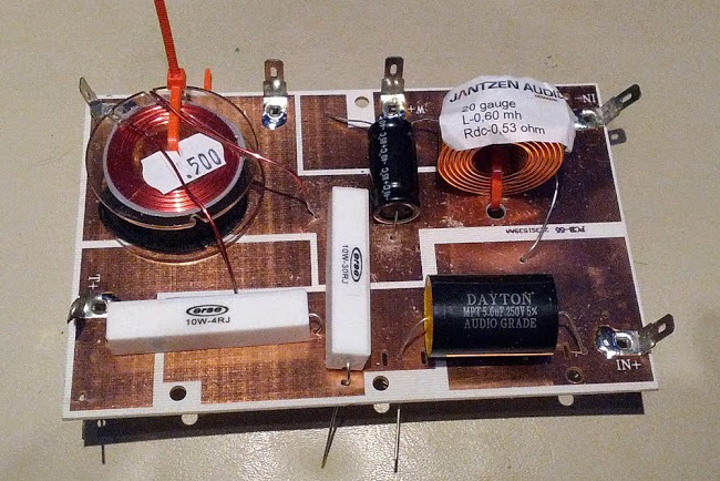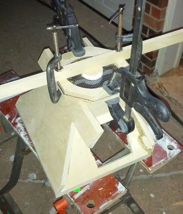 Crossover soldered and glued down (although I'll be taking off that inductor) and I cut the horn to fit in the shell. Eugh, that top section...my angles were not great on the horn top and bottom. Mental note: Get them closer next time. Hopefully close enough though.