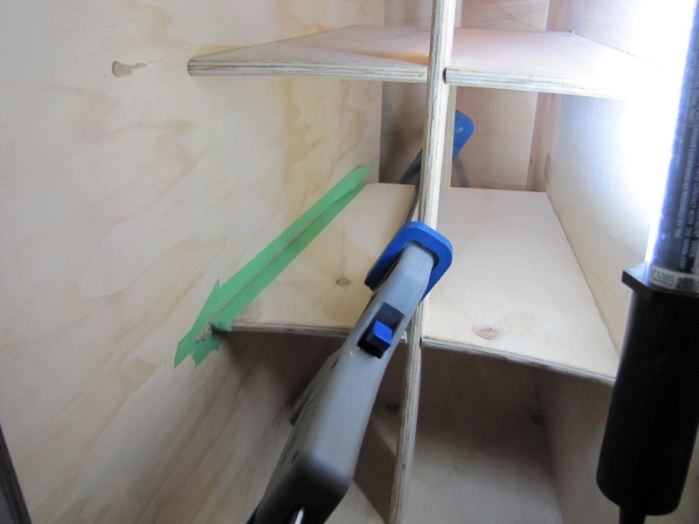 I started to glue the mouth ribs and brace in. I should have taken a picture or two sooner. I was wrestling with how to keep the PL at bay so I can stain this baby and make it look halfway decent. I marked lightly, then masked off around where it would glue. After the glue expanded a bit, I just peeled the tape out. It came surprisingly clear, other than one booger you can see where I smeared on the way in. Horizontal brace was pre-glued, I just have a clamp in to hold the jig / spacer on the back side until the PL cures.