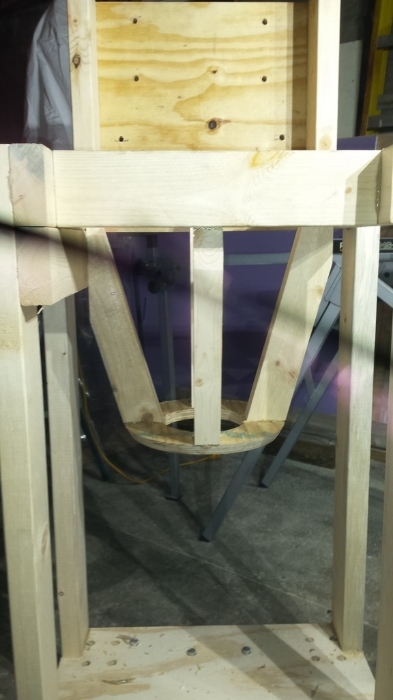 Now you can see where I'm going with this. I've made a platform near the height of the original cyclone inlet. I have a hole in the platform for the suction/inlet of the blower. It's outlet will be inline with the cyclone inlet.