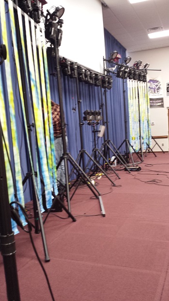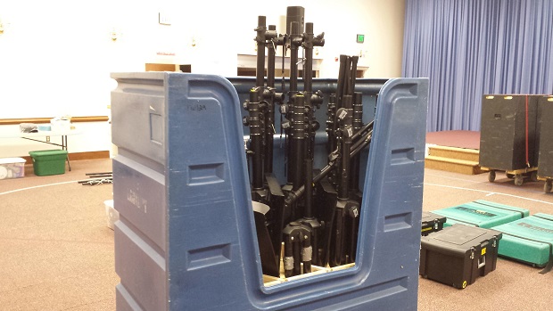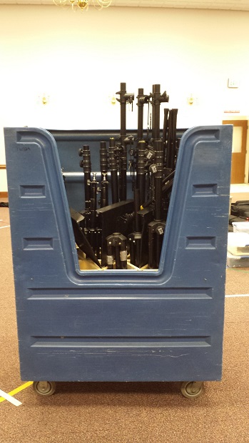 I partner with a lighting guy for a lot of youth events in my area. He uses a lot of tripod stands for his lighting setup. After nearly seven years of carrying all of his stands in canvas stand bags, I built him a cart. This started with a retired hospital laundry cart, some pine 1x4 and some good-old PL. All in all, this reduces the load-in / load-out by at least eight round trips to the trailer.