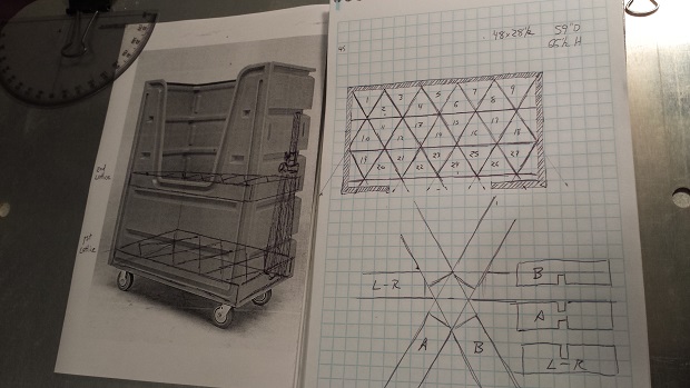 This lighting stand cart was a real joy to make: We were going back and forth about dimensions for a couple weeks when low-and-behold, I ended up at the ER with my youngest (who had just that evening done his first FOH gig (at 10 years old)). I saw the laundry bin and thought "that's perfect". I remembered that the Goodwill stores use these quite a bit. After wheeling and sealing at the Goodwill, I brought home a pair of them for $150.