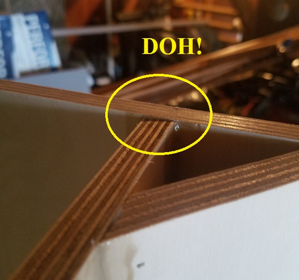 The problem is that Panel #2 is perfectly square, with only a VERY slight chamfer on one end. As you might be guessing, I got confused when I went to glue & nail the panel into place. I didn't realize it until I already had one side of the panel fully nailed... but I installed the panel 90 degrees out of position. This means the slight chamfer will actually meet up with the final side panel when I close up the box. Fortunately, this isn't a huge deal. The angle is slight enough that the PL will fill it in & ensure an air tight joint, and the plans actually mention that Panel 2 could be left square where it meets up with Panel 5 since the PL will also fill that in.