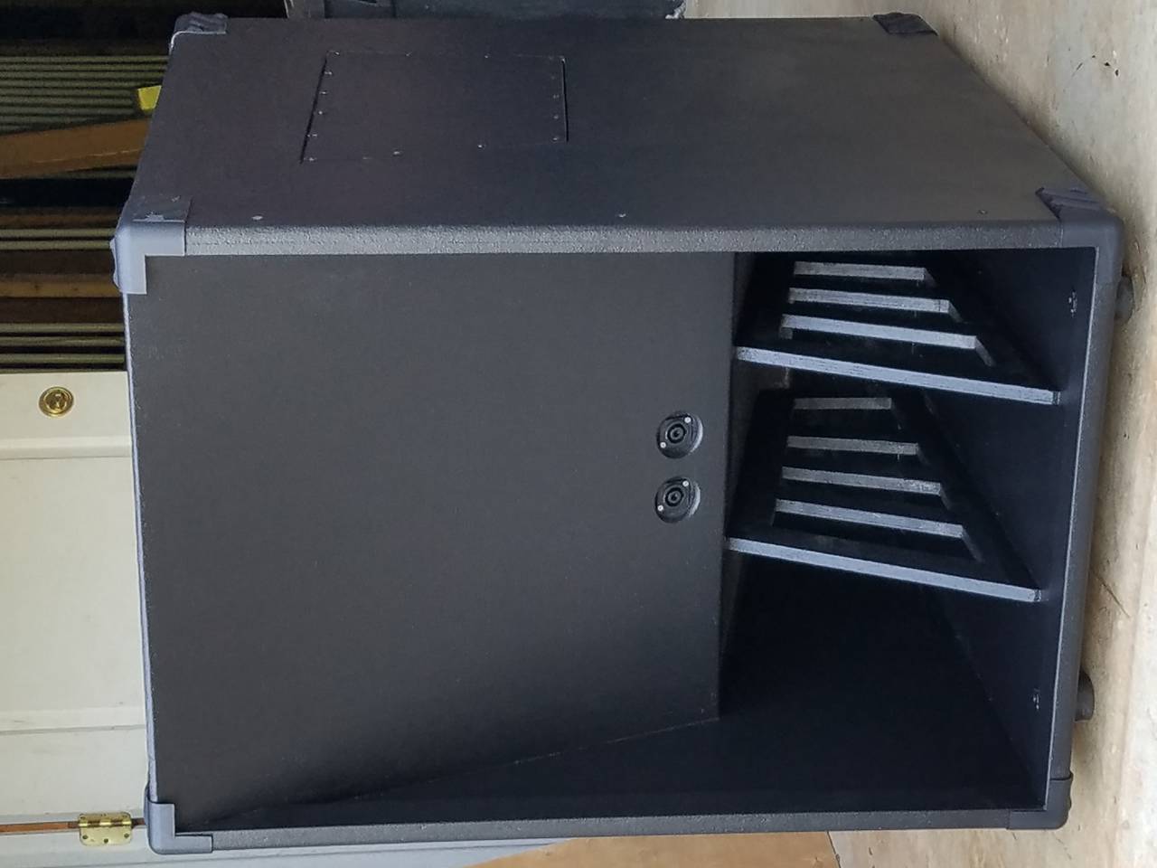Wheels on the back bottom edge, black plastic corners all around. Another coat of duratex on them both. V-plate tee nuts in and sandwiched between the sides and new strips. V-plate is duratexed and has the larger tee nuts in as bushings. Should be all ready for the block party on Saturday now.