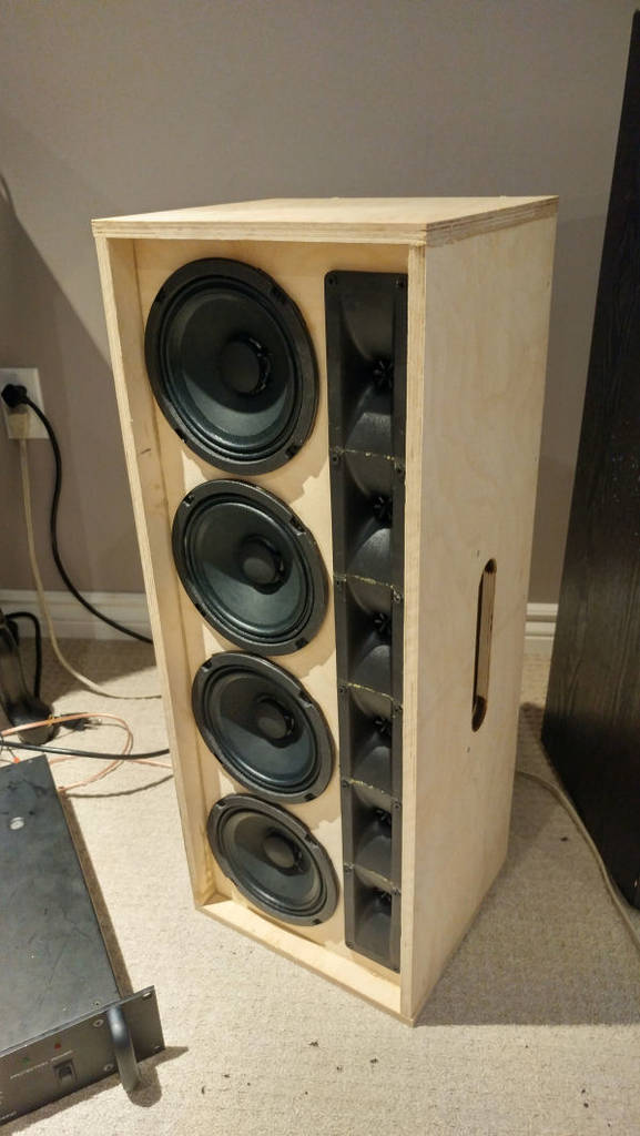 Not that this speaker was mounted in anything resembling what it's final habitat will be, but I was excited to hear what it can do. My first impressions are that the response of the SLA is extremely natural and smooth. Our current setup, which is a pair of EV Sx100+ tend to be unnaturally bright and lack good midrange response, specifically around vocals. We've had complaints of vocalists being lost in the mix, and I can already hear that the SLAs will rectify much of that. I did a sine sweep just for kicks, and just from listening by ear I can tell that the overall response is indeed pretty flat as Bill suggests. There a few peaks here and there, but nothing a little EQ can't fix. One thing that surprised me was the low-end extension. I wasn't expecting much below 100Hz, but from what I was hearing they do reasonably well down to about 80Hz before rolling off significantly. I've never personally been a fan of how piezos sound, but then I've never listened to one connected to a properly-designed crossover. The piezos blend extremely well with the Alpha 6a, and although not as "crisp" as some of the compression drivers I've heard, they sound more natural and complement the midbass quite well. I did notice that 10k peak in response, so once they're all build and mounted I'll so some EQ-ing to flatten things out. Horizontal off-axis response seems good, and it almost seems like the further you get away from the speaker the better it sounds. I'm limited in distance I can put myself from the speaker in my basement, but as I said I just wanted to hook it up for kicks and get some first impressions.