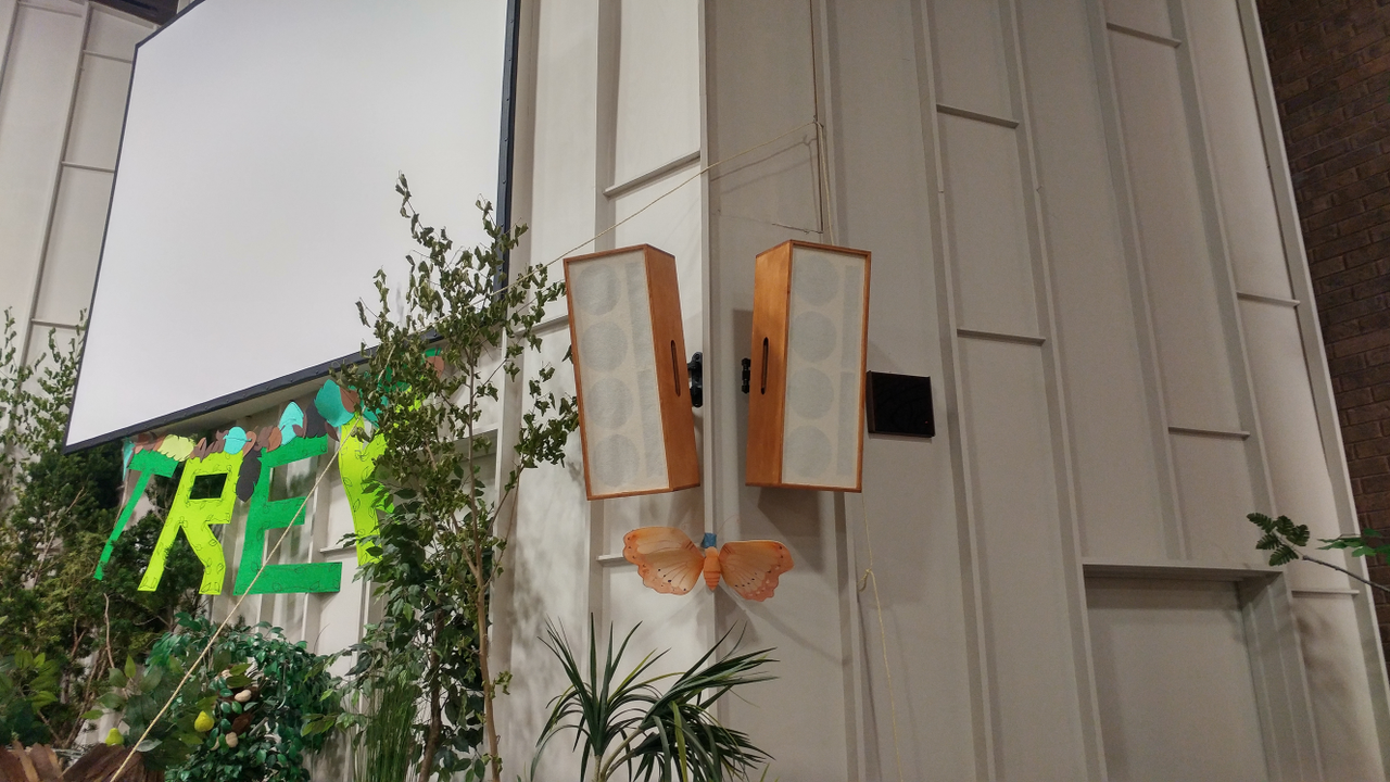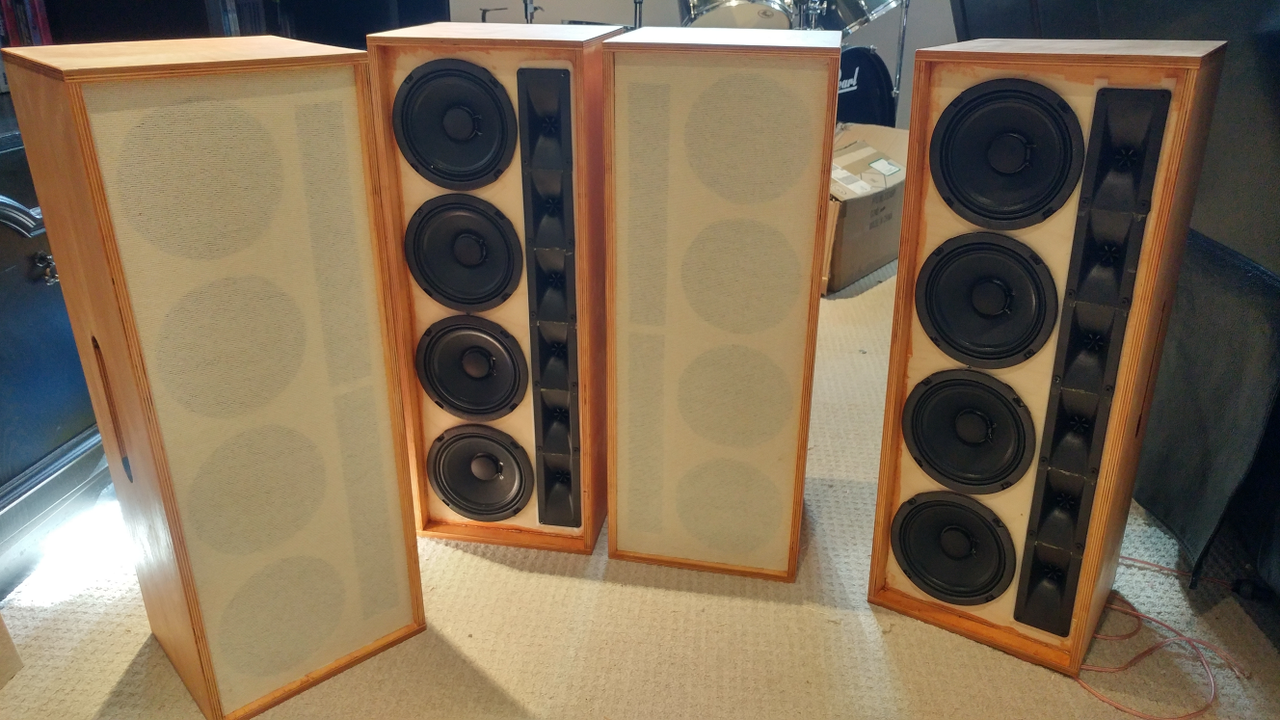The plan is to fill all the holes, sand the boxes down, stain them with a light-colored stain and then cover the baffles with grille cloth rather than expanded metal. It's a cosmetic choice, as I'm sick of looking at the big, black looming EV speakers that stick out like a sore thumb.