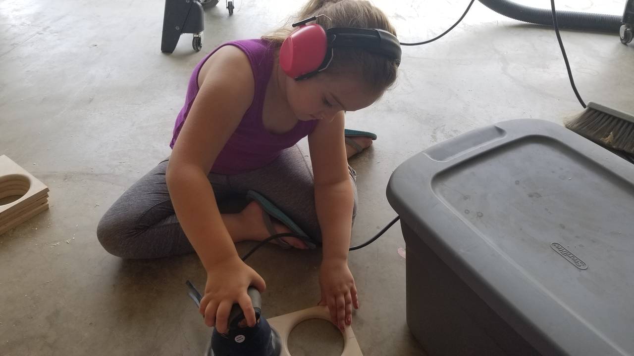 I went out to work on the SLAs some more and my glue monkey wanted to help prep the curve baffle. So I showed her how to use the random orbit sander and sent her to town.