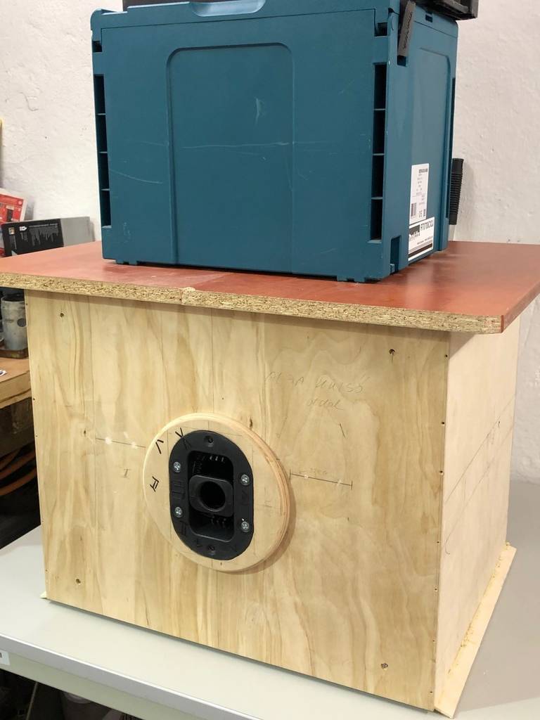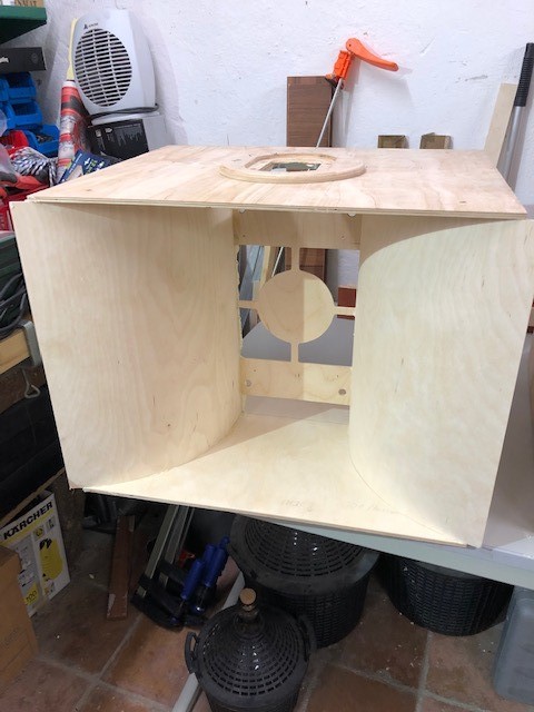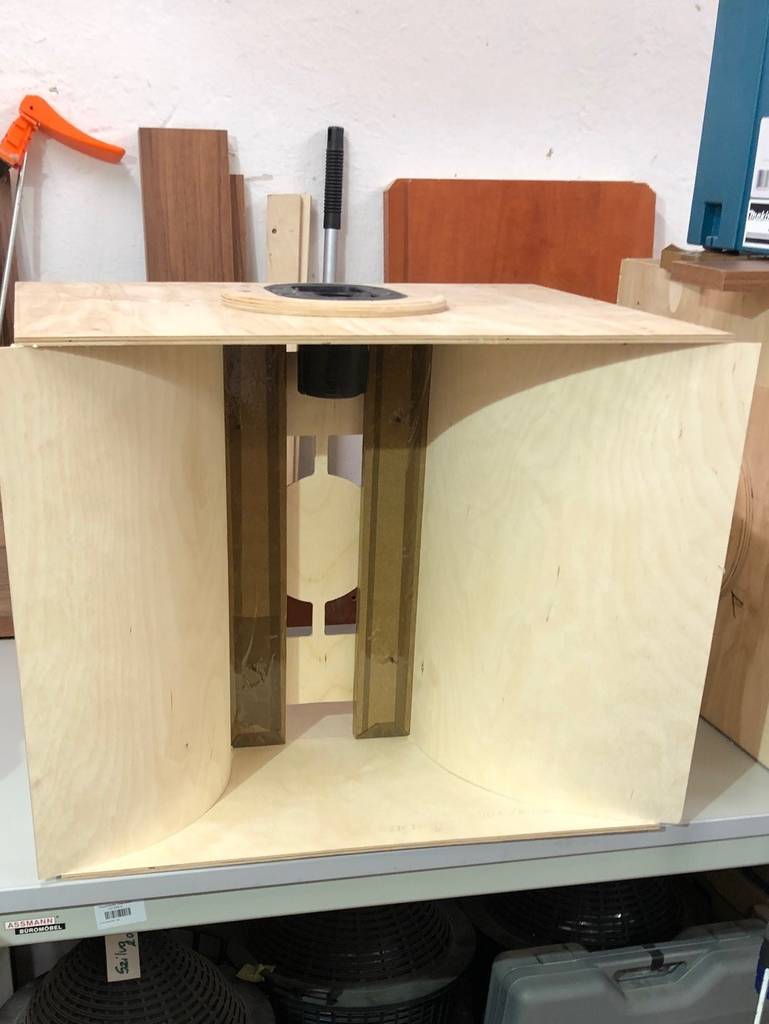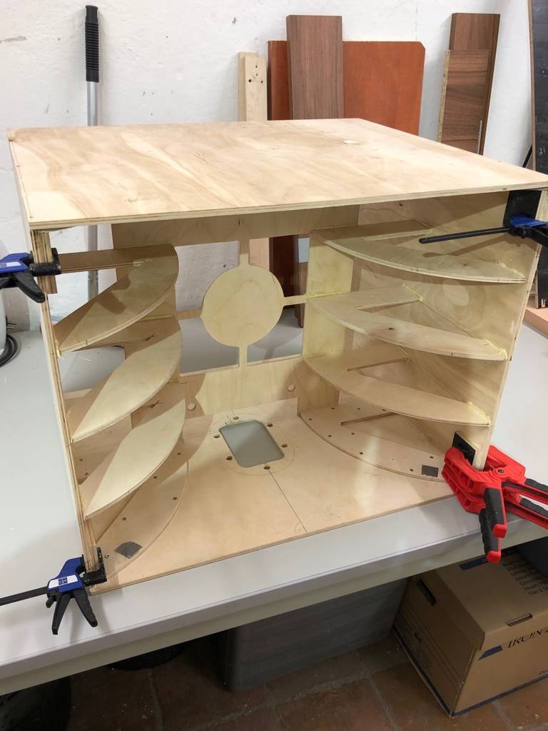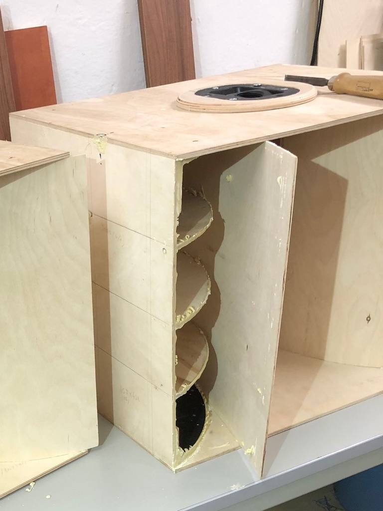 I added some “extra” scrap wood to reinforce the joint between the horn sheets and the Baffle. First I applied adhesive only to the joint of the baffle and sheet, than inserted the sheet and clamped the scrap jig. Tis time I was able to check the connection between the inner side of the sheet to the baffle and to the beginning of the braces. When all was in the right position I applied glue to the rest and turned the cab face down on the edge of a table so that the end of the horn sheet was over the edge. I gradually pushed the cab from the edge of the table to the middle. I could see from the back how the sheet curved to the braces.