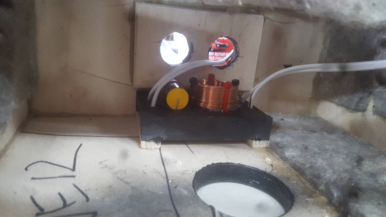 When I cut the legs for the crossover I didn't account for the depth added by the zip ties, so I propped it up and glued it to some scrap ply then hot melt glued it where I wanted it.