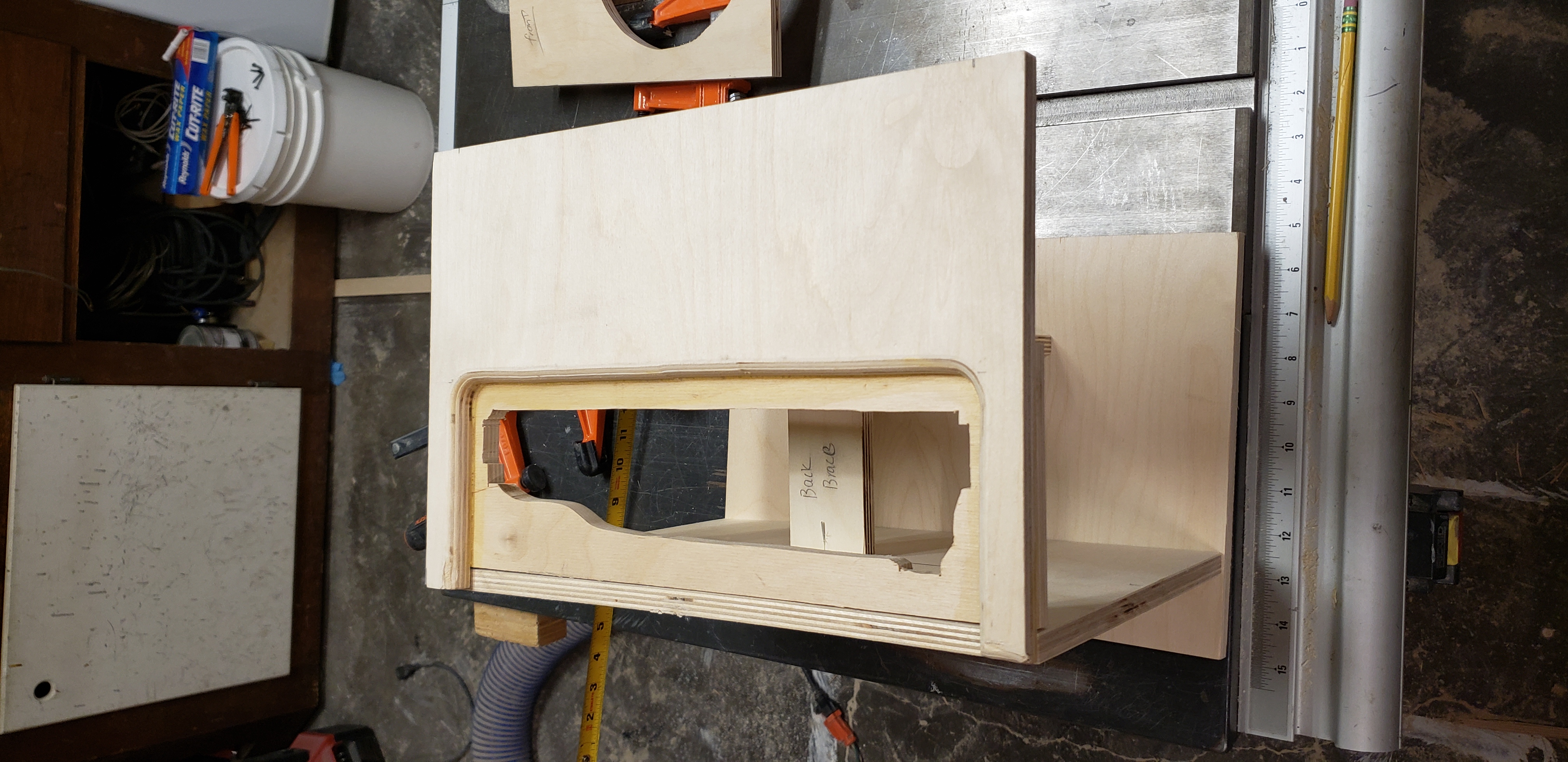The hardest part was the roundover around where the amp is recessed on the side. The bering on my roundover bit is too deep to route after the cab was completed so I clamped the side piece to the edge of my work bench and gave it shot.