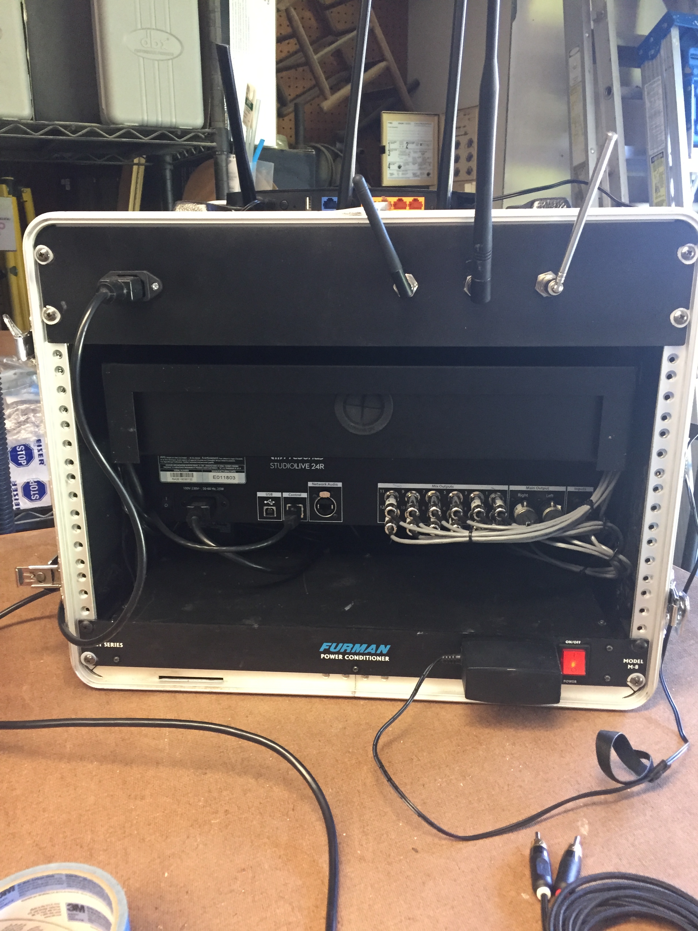 The idea we to keep their hands out of the back of the mixer - period! That meant making sure that everything came to the front. The other issue was that there wasn't room for everything in the rack, so the Furman Power supply went to the back. Or course, the danged power cable for the Furman would have to be stuck in the back - so, that wouldn't do. Mike found a blank panel that I installed on the back of the rack with an IEC power connection and three of the transmitters antenna via extender cables. I was worried that the signal wouldn't be good with the antenna inside the case. One transmitter had the antenna in front.