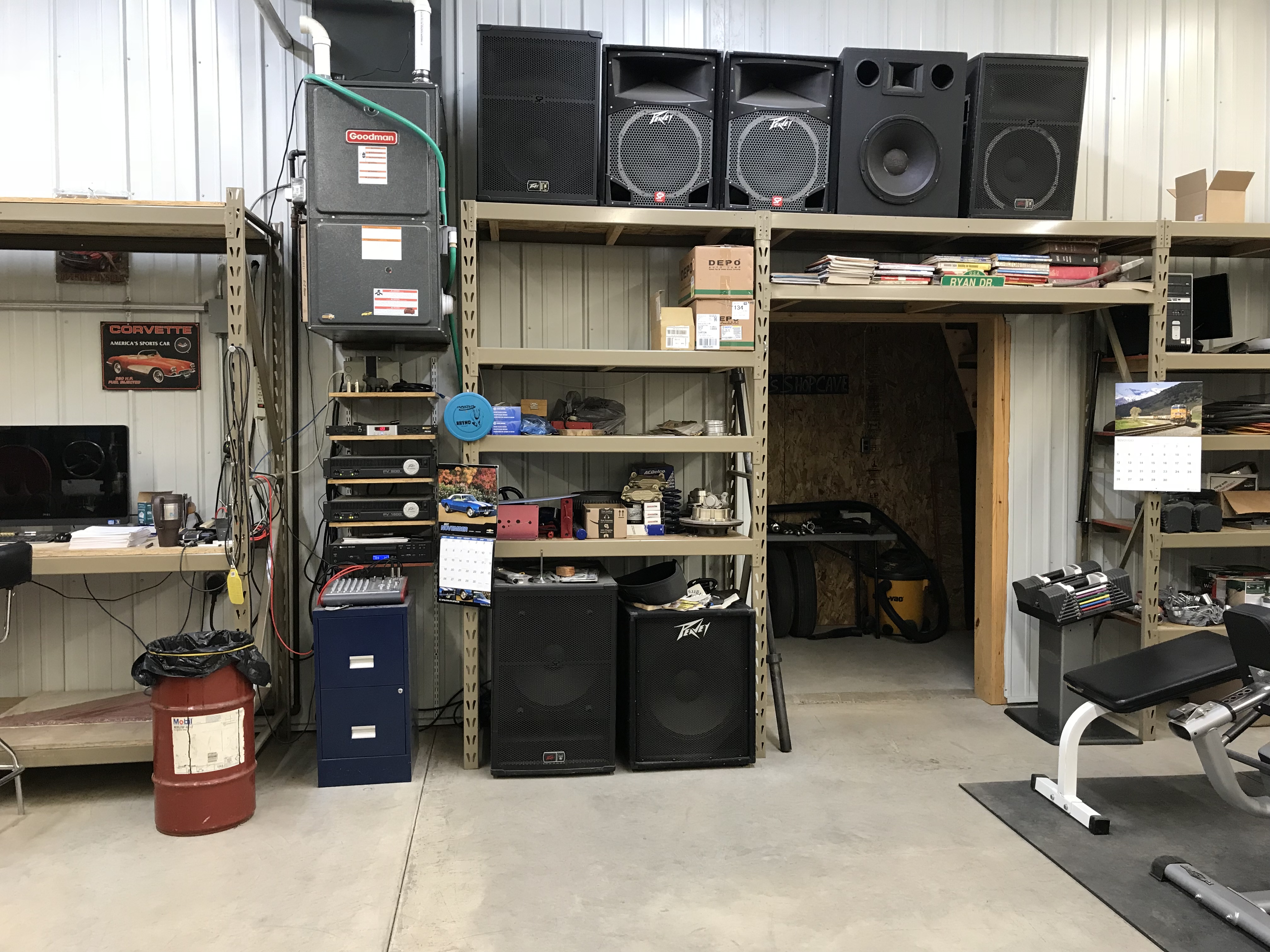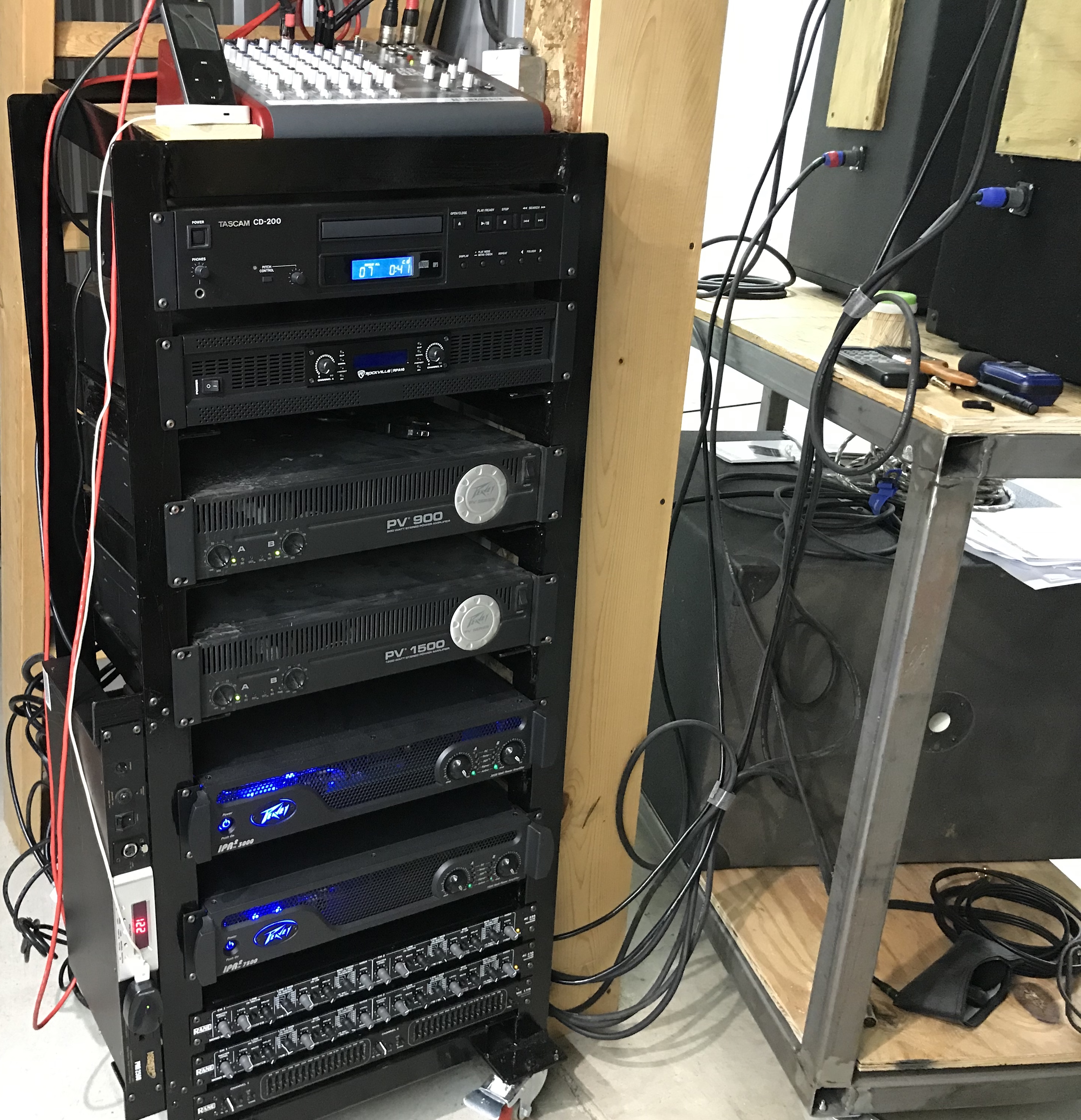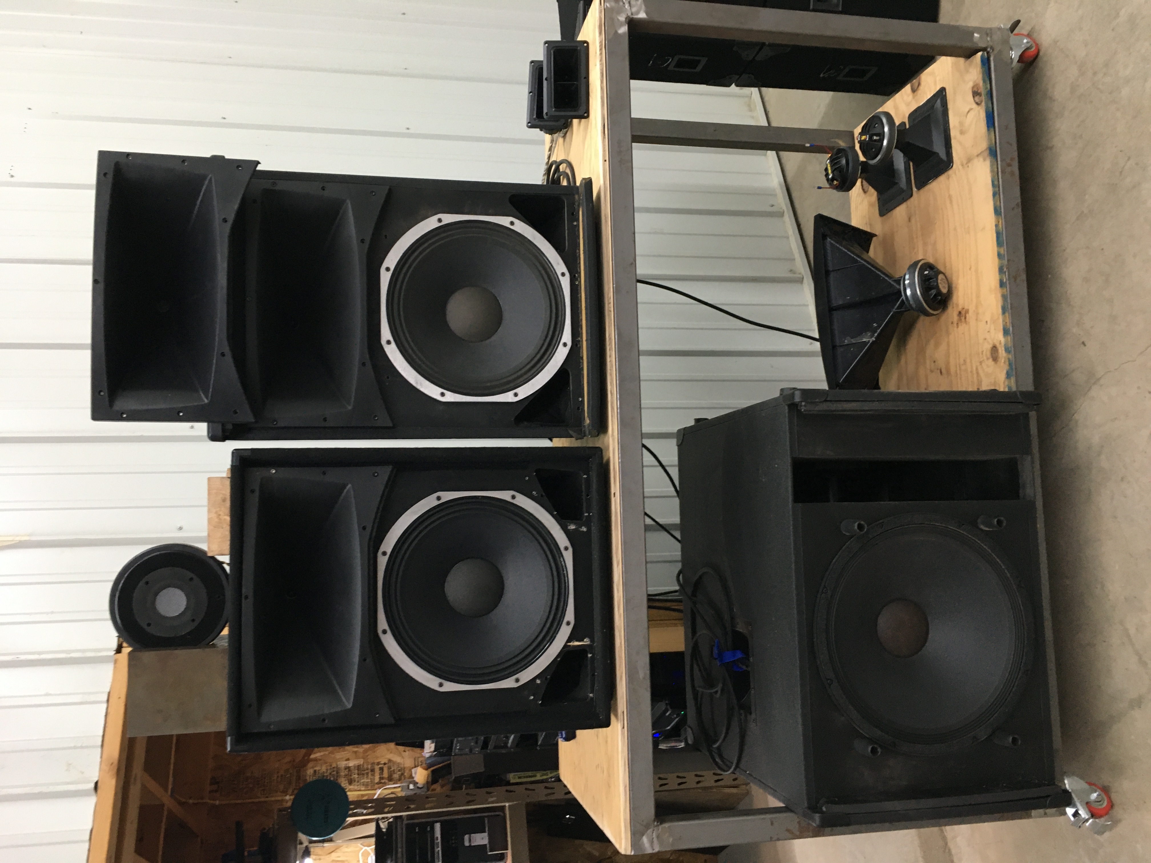 My shop is 40x48x13 tall ceilings and I’m running peavey 900, 1500, (AB)style and newer peavey (D) 7500 and 3000 amps to power my peavey SP5 tops and SP118 sub and my upper voice horns and tweeters all divided by Rane 23s active 4 way split.