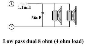 I'm using the high pass crossover for the mid-only (no tweeter) configuration, 22uf and 33uf caps, and 5 mH inductor... Same question I guess for the woofer crossover point...1.1mH ind and 66uF cap...