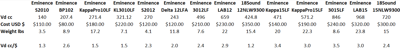 Scanning the chart, I happened to notice that the Vd/$ is the same as Vd/pd for the 18sound15. Thanks, though, for your effort.