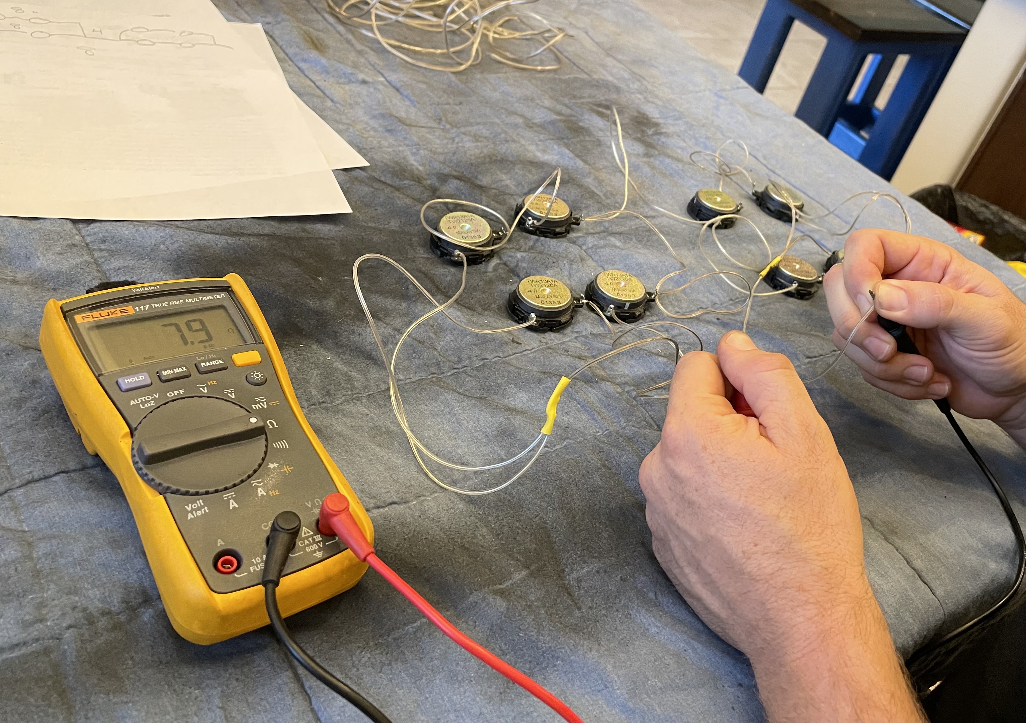 Progress on the center channel speaker. I have pieced the filter together. I wired up the tweeters and tested them. Getting closer!