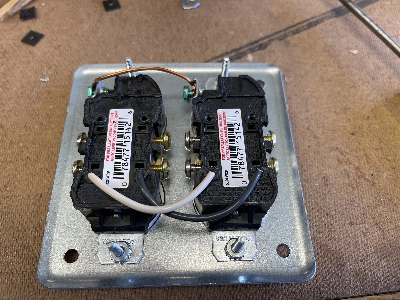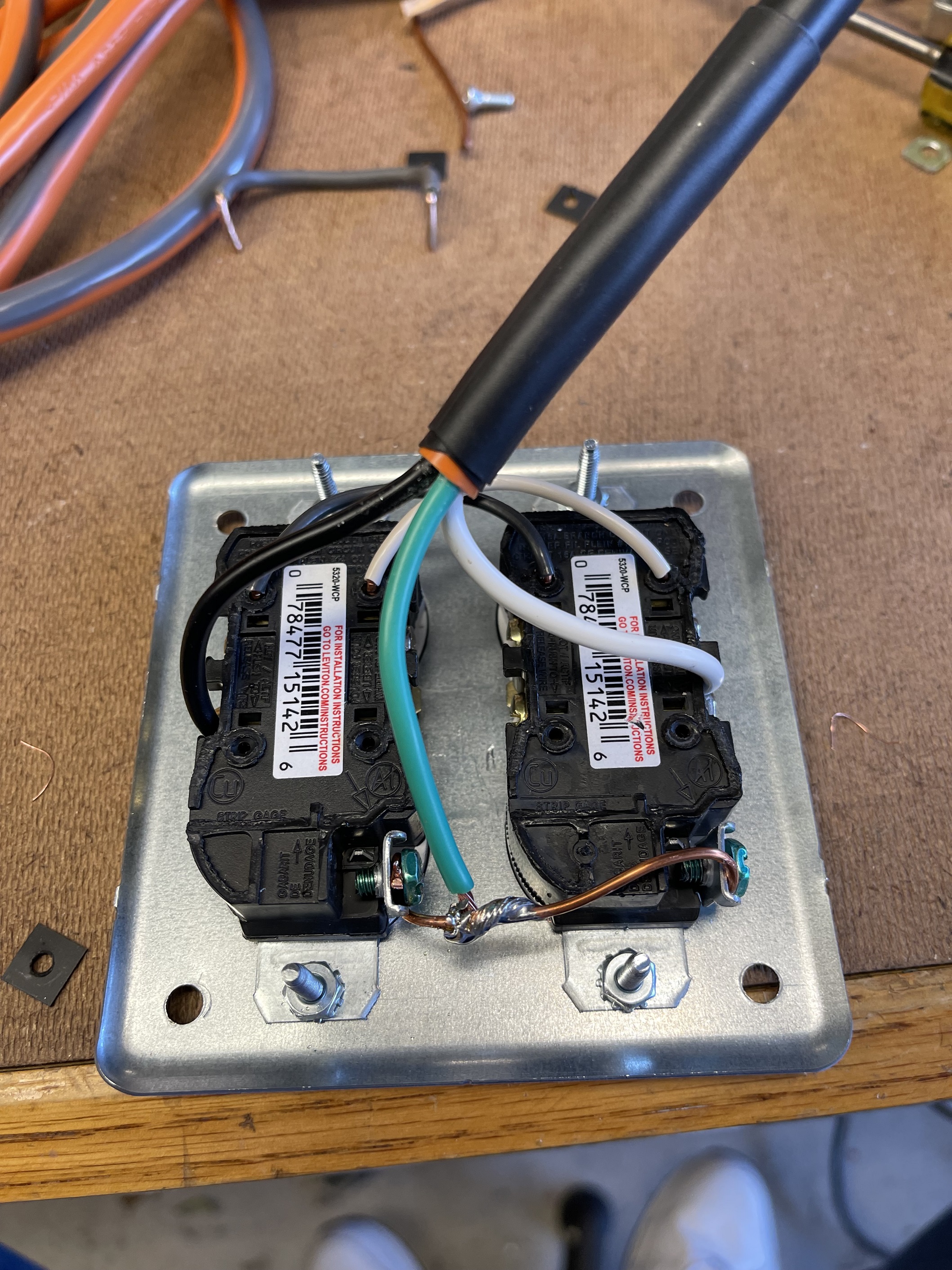 Started by installing the outlets to the top plate. Once that's done, then you put jumpers between the two outlets. I had a piece of 14ga Romex laying around, so I used that to connect 'em. Some people don't know that the outlets have push-in connectors on the back. Just shove in the solid Romex wire and you're done.