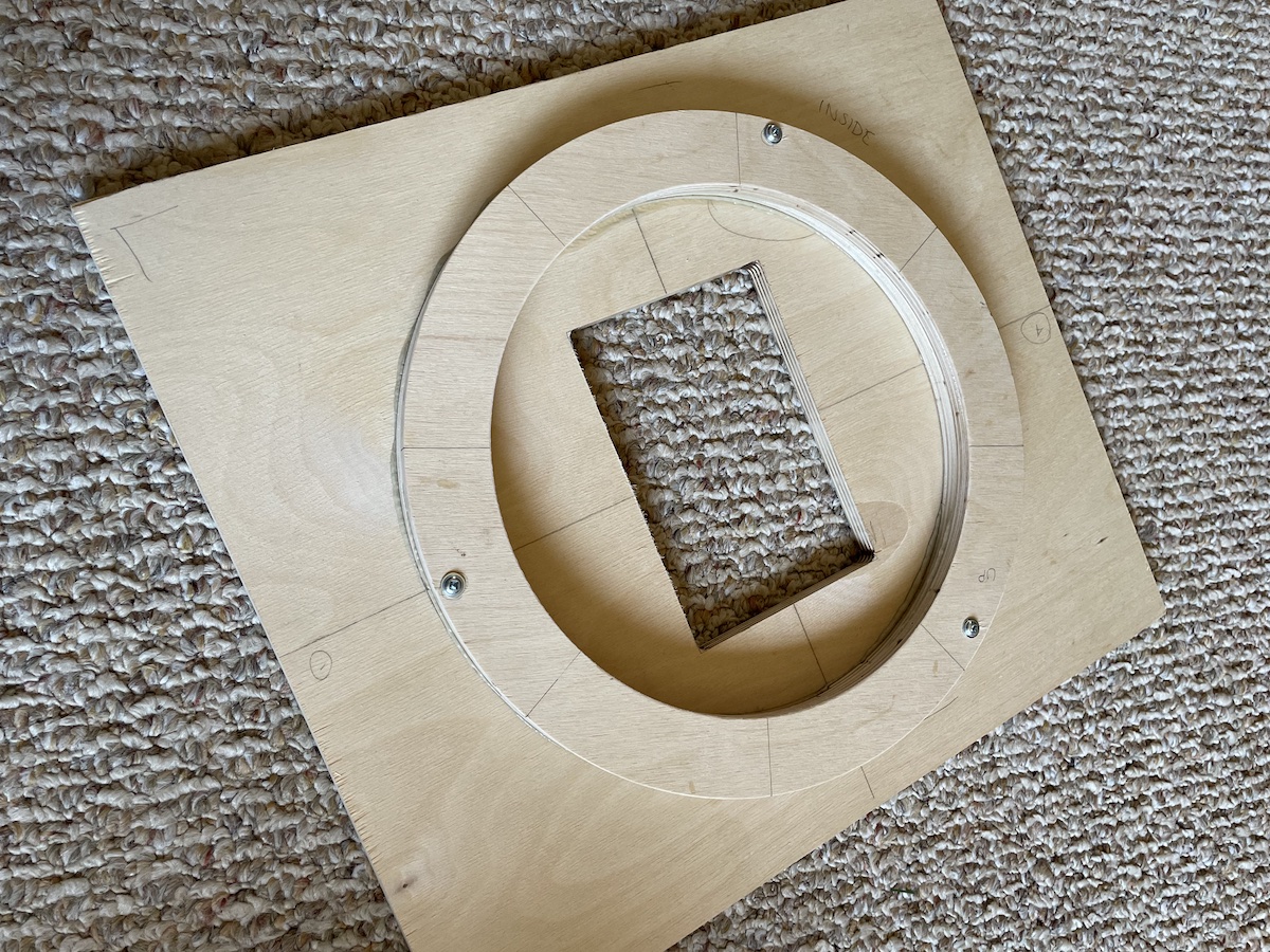 Slow going, but the baffles are where attention to the details really count, in my experience. Here I've located, centered, and glued the spacers down in one step using using a trio of long shank pocket hole screws, cut so as not to protrude all the way through the baffle.