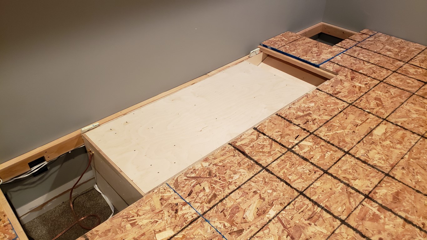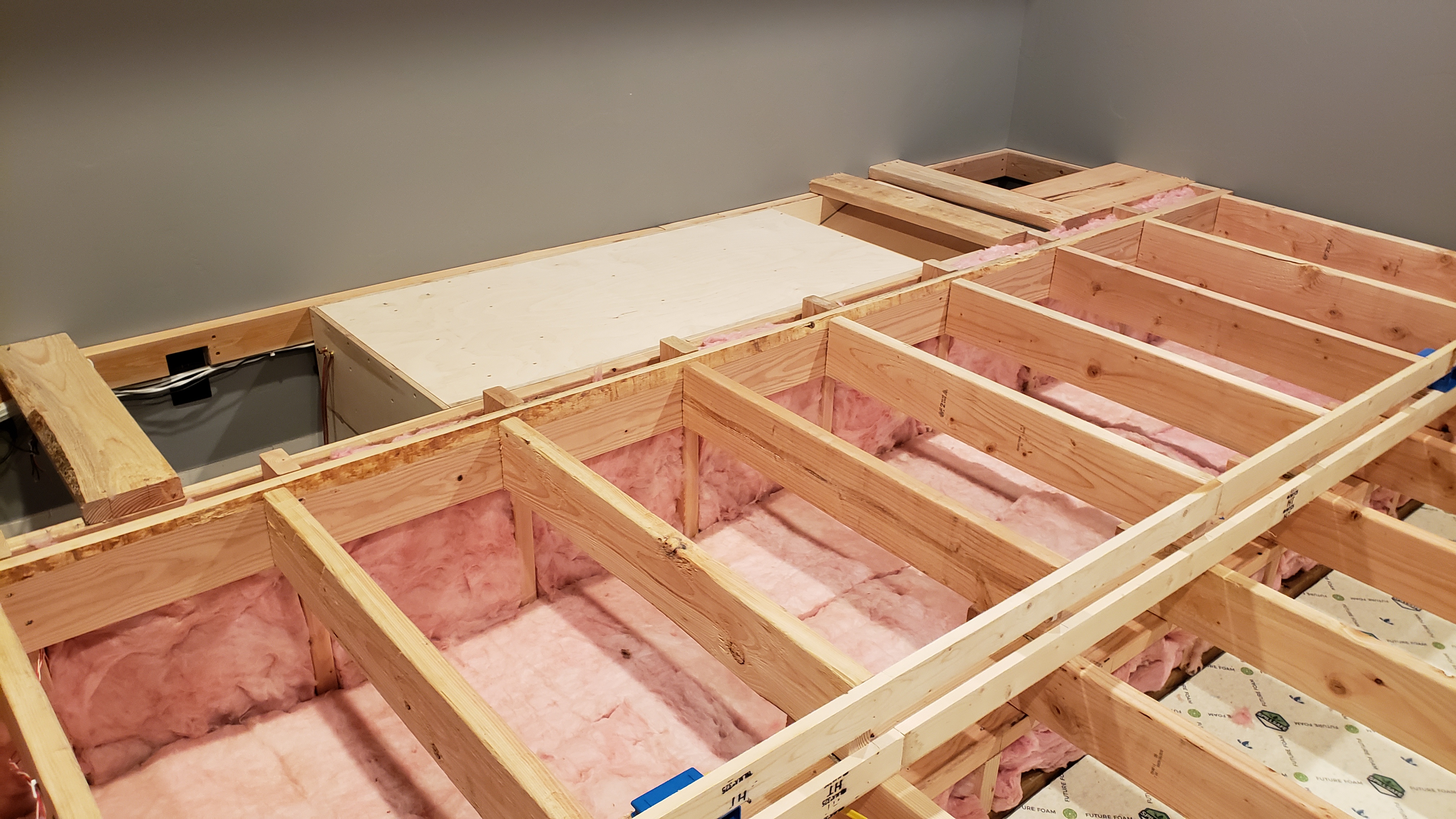 The theater rebuild is coming along. Cabinets are hung, no lacquer yet. I have the riser mostly finished. The first level is 14", second level is 21" - just enough to clear the THTLP. The first level is built with 2x6's spaced 16" oc and spanned 7.5 feet. Every joint and surface is glued with PL Premium. One layer of subfloor feels nice and solid, I really don't know why so many people insist on two and three layers of subfloor. At $76 per sheet I'm going to settle for one layer. I filled the whole thing with pink fiberglass insulation. When the THTLP really gets going there's quite a bit of tactile feel in the lower level of the riser (where the span is 7.5 feet). I guess I might not need butt kickers.