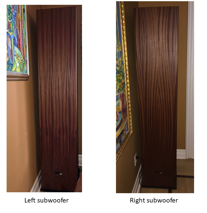 My THTLPs are minimum-sized (15"x18"x72"). I built one of the THTLPs (the right subwoofer) and Tom Smit built the other (the left subwoofer). Each is powered by a Dayton SPA250DSP (250 watt) plate amplifier and uses a 12" driver. To get them to play well in my room I ended up not making use of the DSP capabilities of the SPA250DSP and using a MiniDSP 2x4HD to "dial them in" instead.