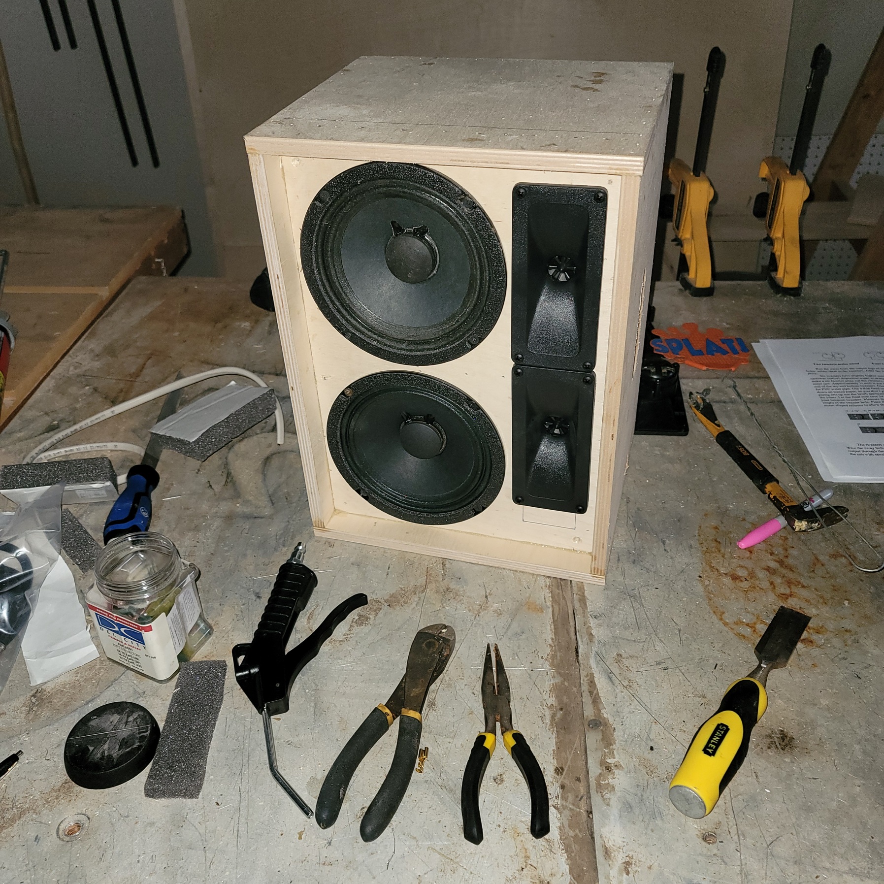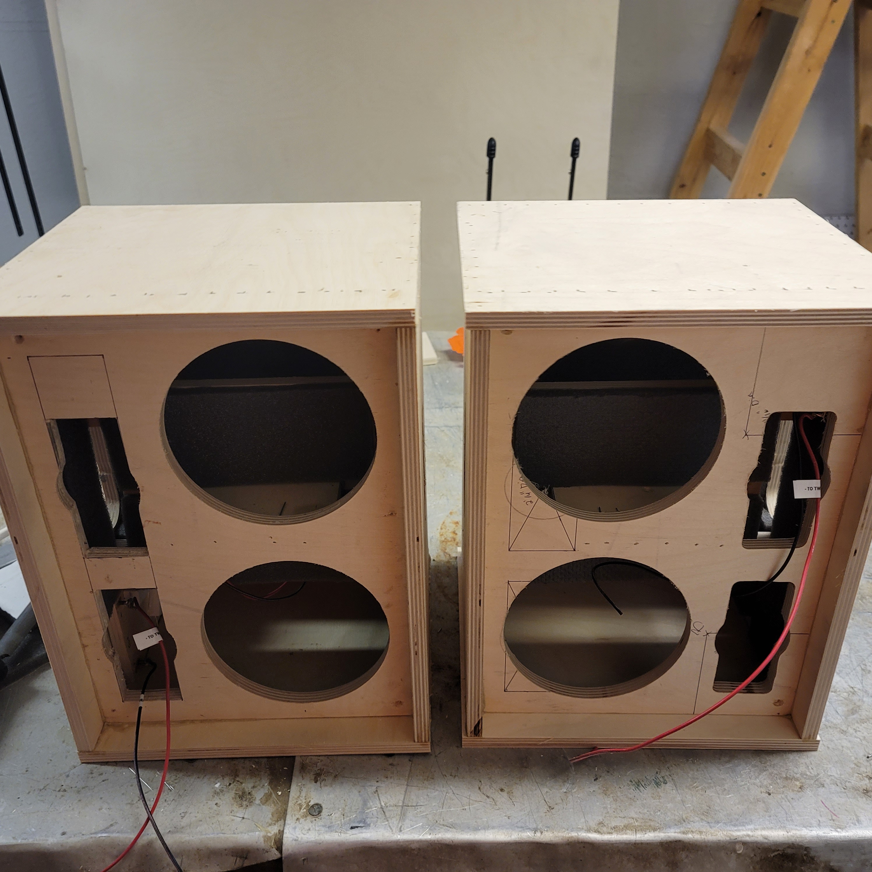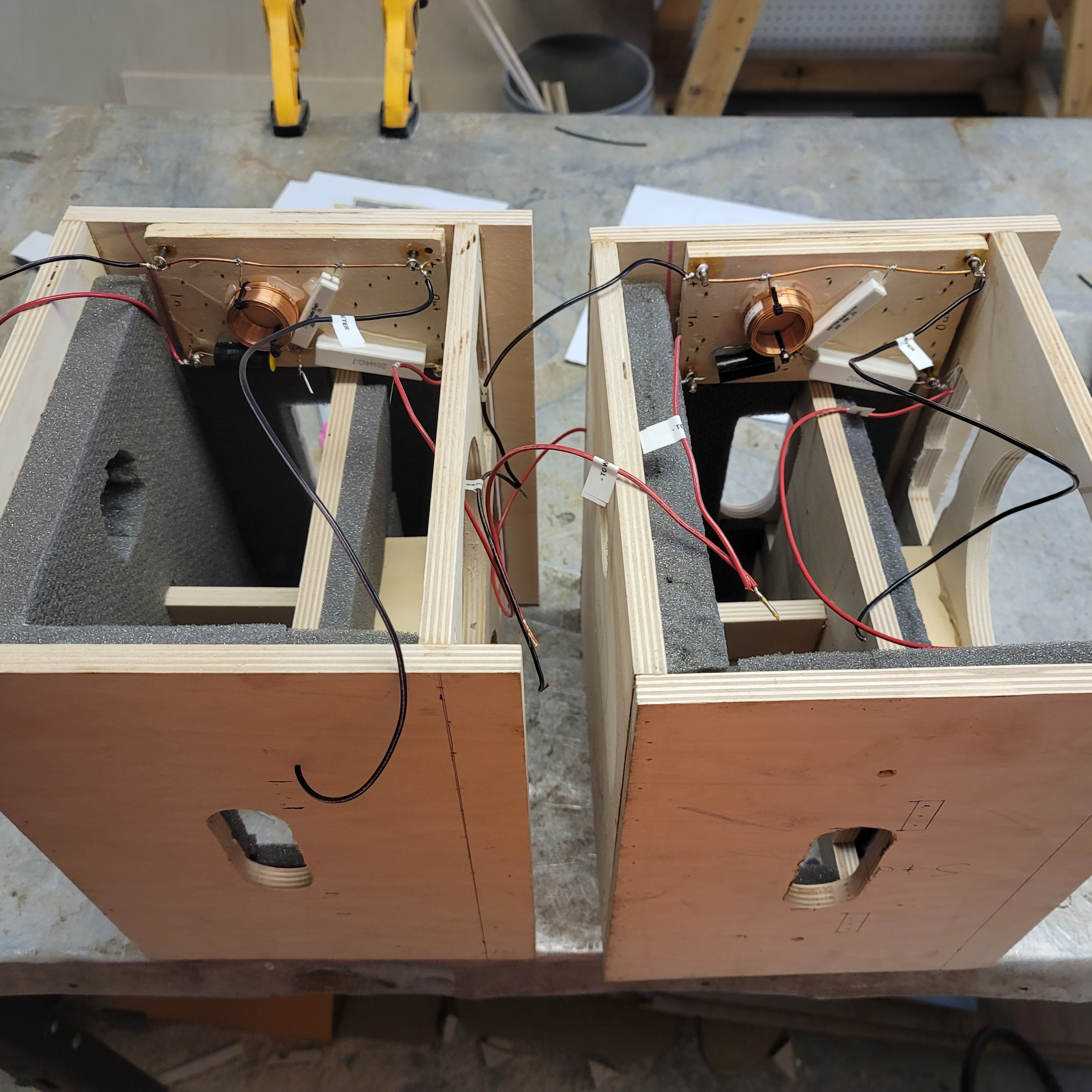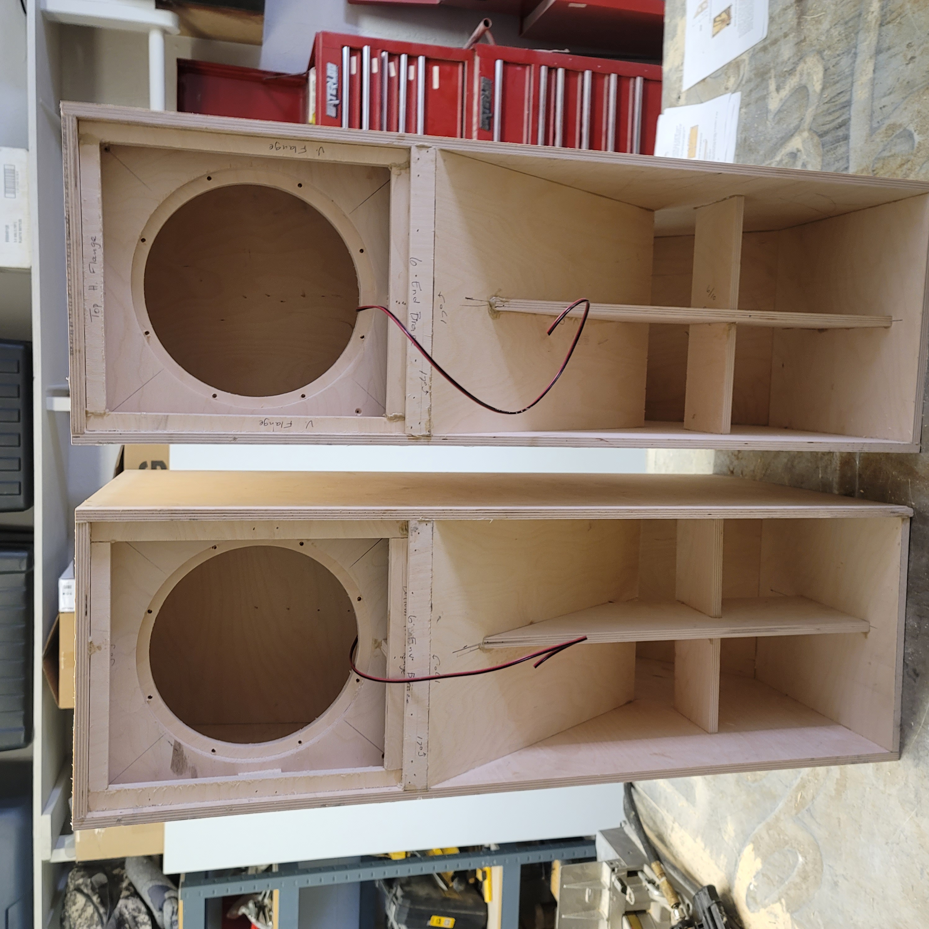 Got about 4 hours in the shop today. First, I finished putting foam in the cabs. Then I put the sides on. Then I finished the second crossover and mounted them.