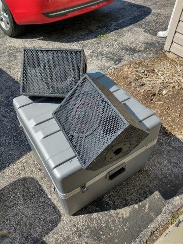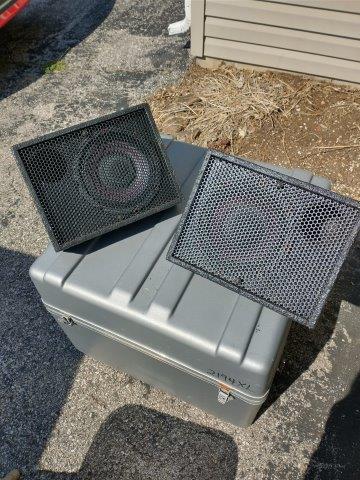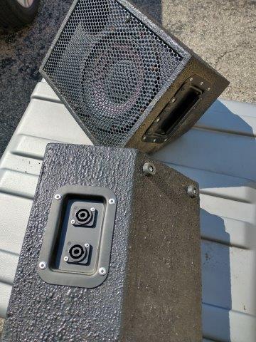 SOLD - 2 tiny monitor wedges. Loaded with Eminence 8" coax drivers. Have grilles, handles, pole mount, coated in truck bed liner. SOLD