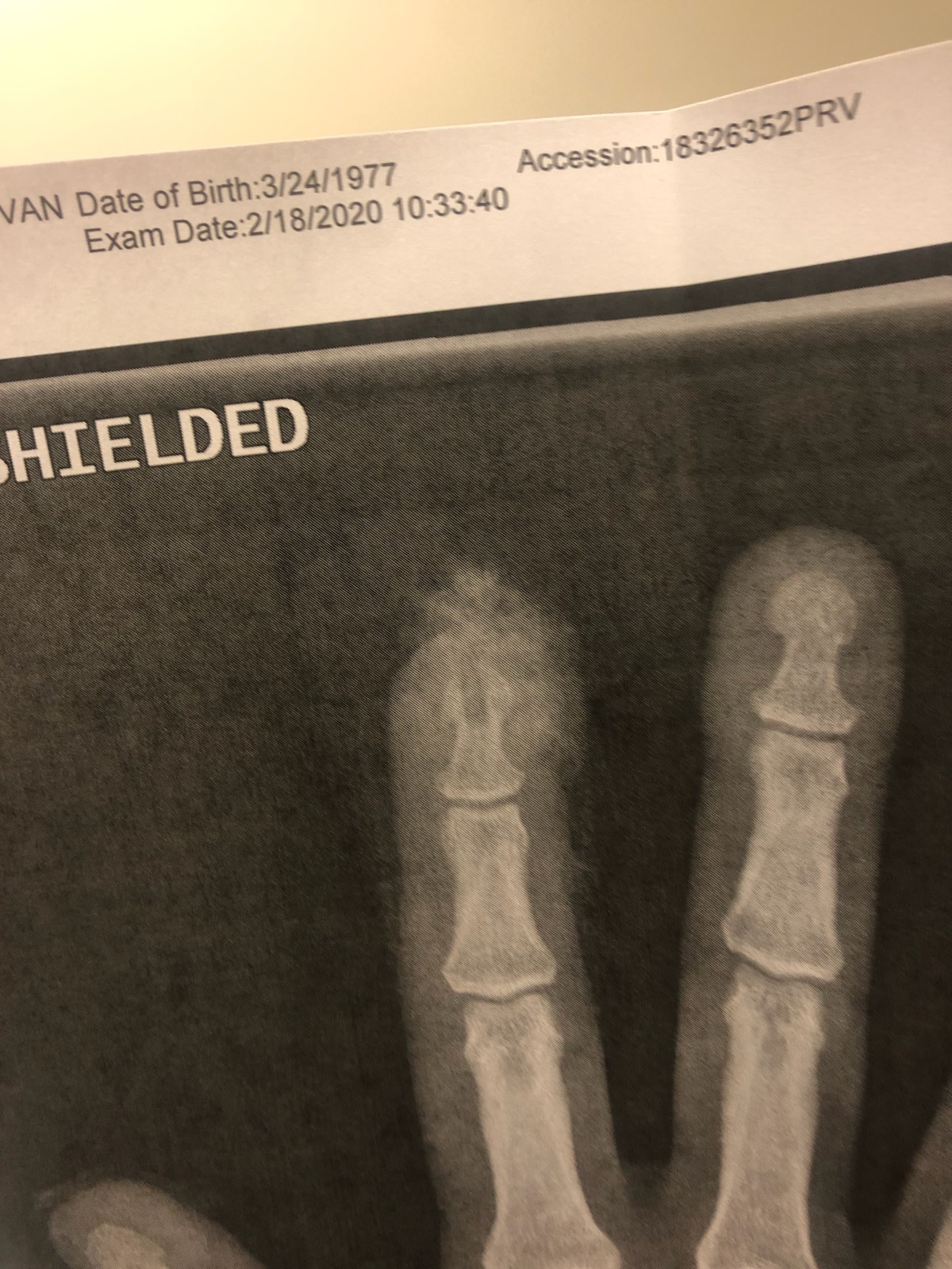 My cousin... not-so-much (note that the table saw blade tooth "V" shape can be made out on the x-ray)