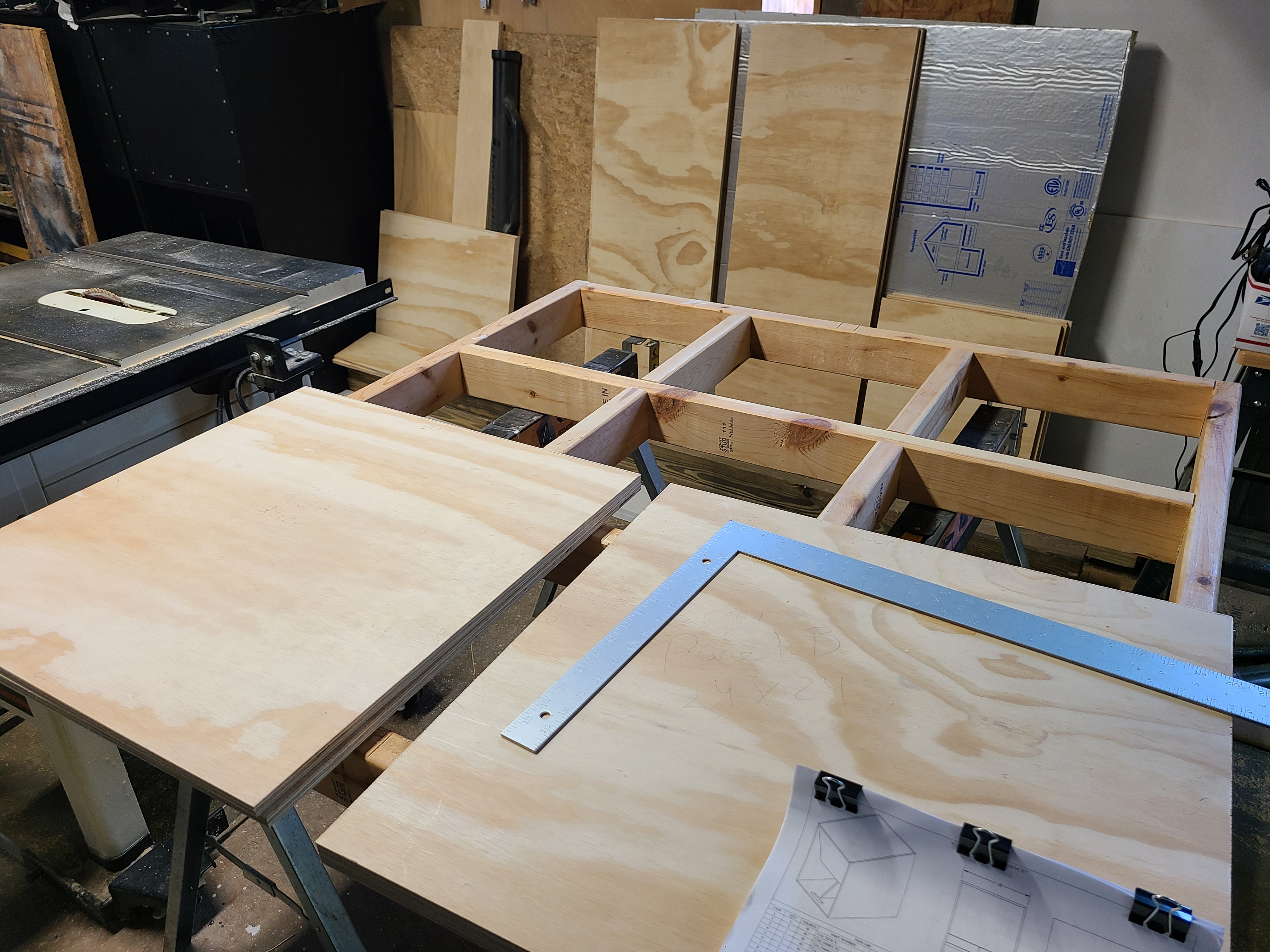 I feel like I made some progress today, but not as much as I expected. I laid out one cabinet worth of 'nest' on a 4x8 sheet to plan my cut strategy (see my pix). I didn't have an assistant today, so I used my THT build platform on sawhorses as a makeshift outfeed table. I cut 41-1/4" off each sheet with a circular saw. After cutting two chunks like that with a circular saw and an edge guide, I could manage the remainder with the outfeed table. That allowed me a 24 x 24 side and a row of 17" wide panels, plus a little stock. My sheets seemed pretty square. Then I set my table at just under 24-1/8 and cut a strip on those small chunks across the 48". That left me some to clean up the factory edge. then I turned the piece and cut out the corner for a 24x24 side panel. Next I set the saw for 17 and some fuzz, leaving a strip i could cut panels out of and shave the other side off to clean up my circular saw cut. Then I ripped another 17plus off the larger remainder sheet for more panels. then I went back to the 24 and a fuzz and nocked the other side panel out. That left me a few 17plus pieces to cut out and scraps for braces. Then I set my saw for 24 and squared up all 4 side panels.