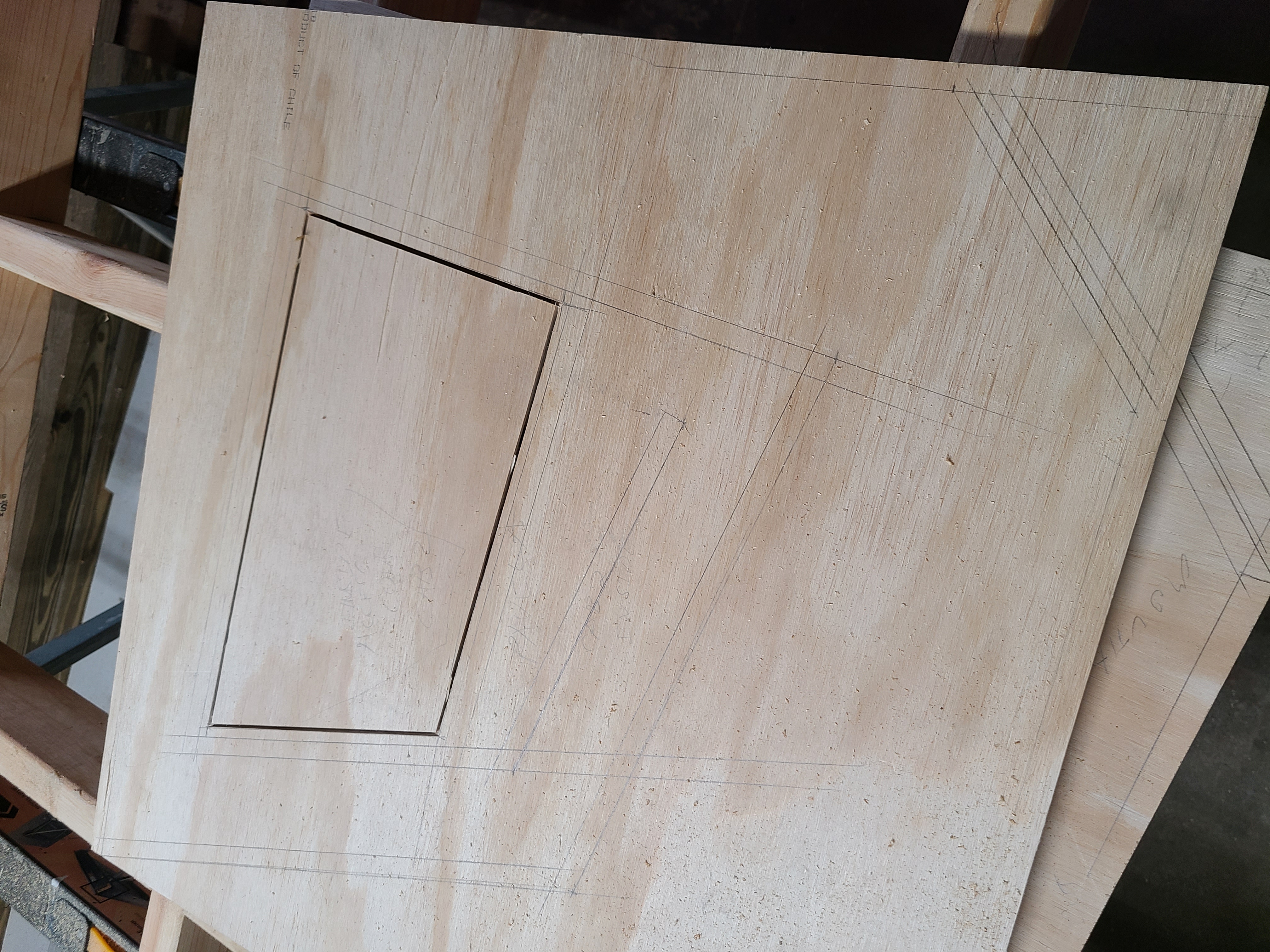 Got the worst part out of the way. I HATE plunge cutting the access panels. I'm always worried the saw will jump or I'll cut too far. I used one of my laminated 2/4's as an edge guide to make the plunge easier (similar to what the plans suggest). I cut both sides to gut as much with my new Freud thin kerf 60 tooth plywood blade. Then I finished the corners with a multi-tool. They turned out pretty good, enough so that I can swap access covers and they fit reasonably well. Then I cut all the panels down to finished width and almost finished length. Had to break for lunch but I'm head back to start making angle cuts.