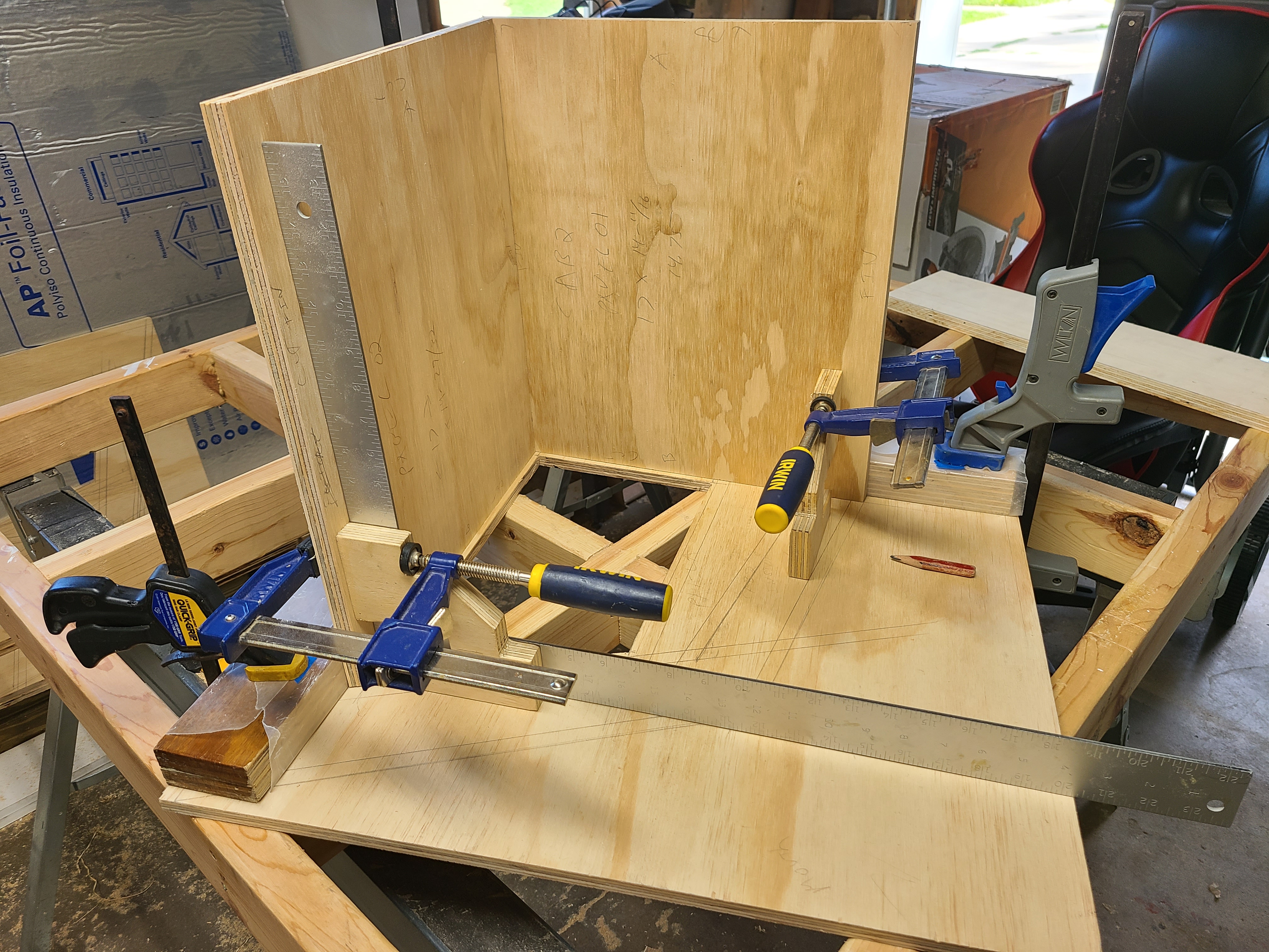 I started laying out the construction lines on all the side panels. This is where I ran out of steam. Like Bill mentions, I should have cut off a few steps. I'm trying to build the pair, so I setup the saw once and cut twice to save time. So i'm trying to pick my sides, good Arauco side out on both, and trying to decide if i make them the same or a mirror image. I had two panels all laid out inside, then started to transfer outside for a nailing guide. Then I thought, second side I probably will just clamp, so no layout needed. Then I went back to my 'pair' and thought I had one layout backwards, so I flipped it then realized I was on the inside and it's backwards anyways lol. I give up for today.